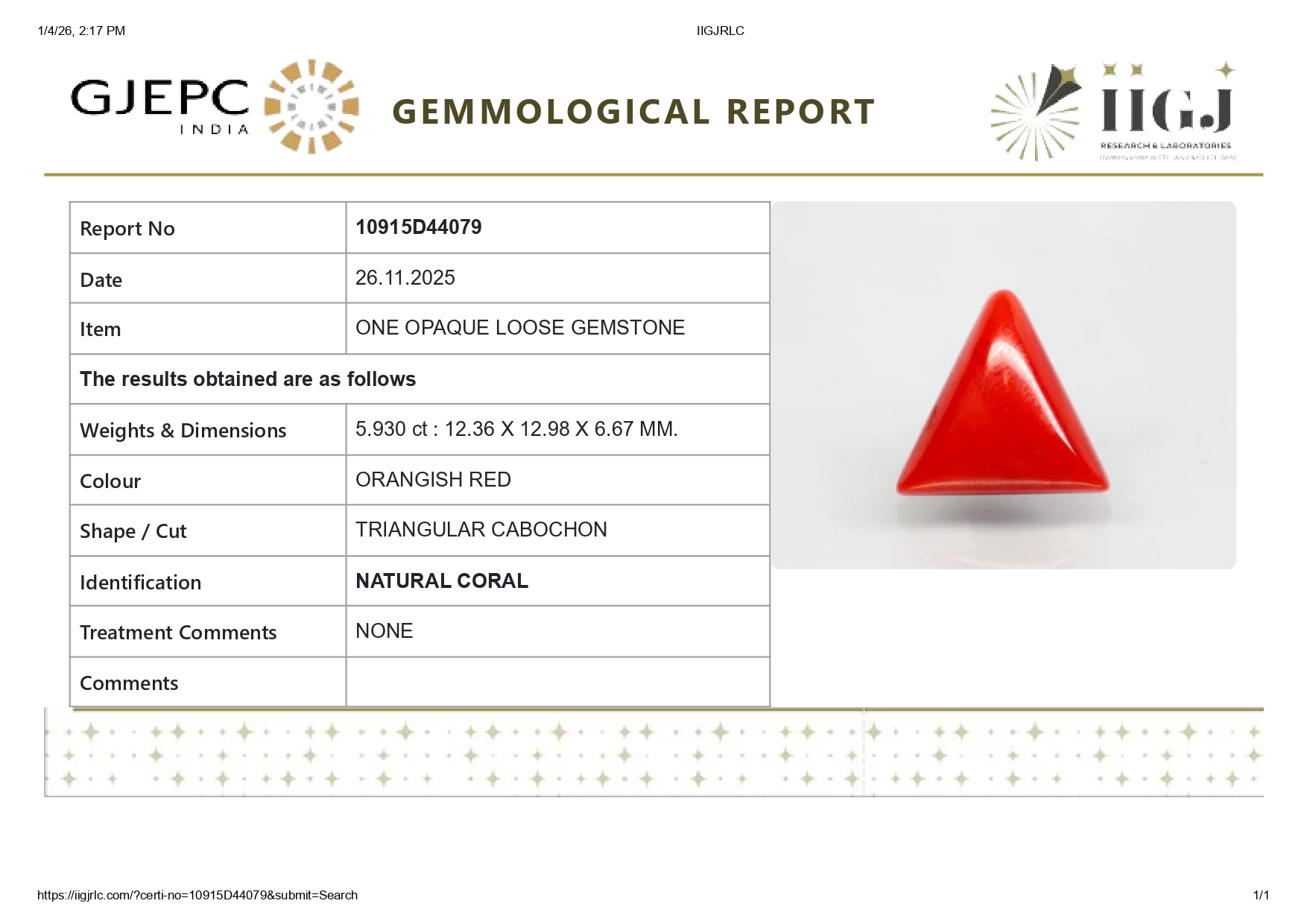 Buy 5.93 carats (6.52 Ratti) 100% natural Italian red coral (Moonga) stone online, directly imported from Italy (also called available"Italian Red Coral"). Moonga Stone is a source of enormous power & strength. Check out the exclusive inventory online all shapes (Triangular, Capsule & Oval) with a reputed IIGJ Certificate