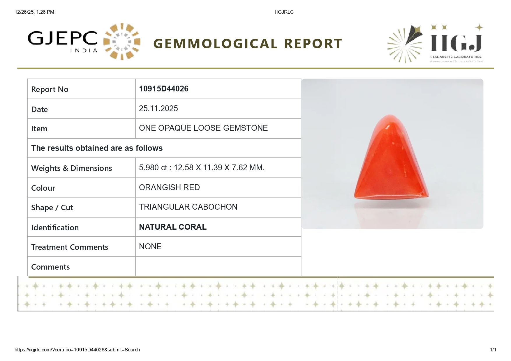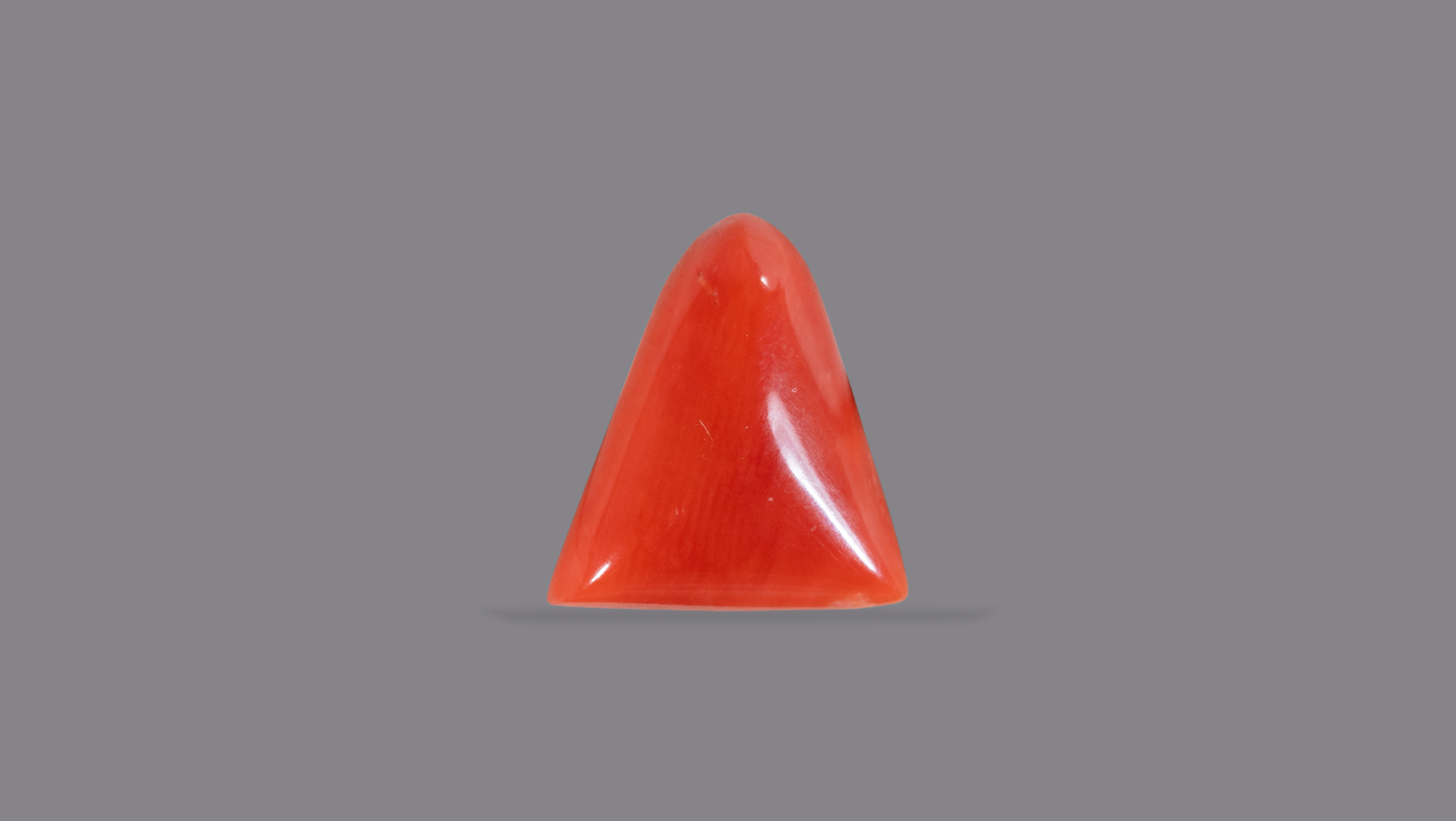 Buy 5.98 carats (6.57 Ratti) 100% natural Italian red coral (Moonga) stone online, directly imported from Italy (also called available"Italian Red Coral"). Moonga Stone is a source of enormous power & strength. Check out the exclusive inventory online all shapes (Triangular, Capsule & Oval) with a reputed IIGJ Certificate