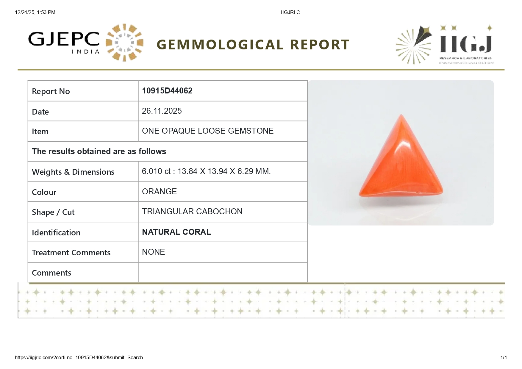 Buy 6.01 carats (6.60 Ratti) 100% natural Italian red coral (Moonga) stone online, directly imported from Italy (also called available"Italian Red Coral"). Moonga Stone is a source of enormous power & strength. Check out the exclusive inventory online all shapes (Triangular, Capsule & Oval) with a reputed IIGJ Certificate