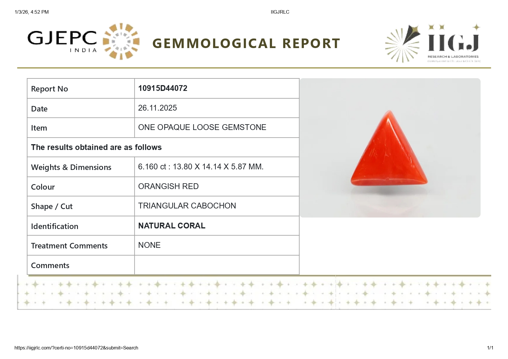 Buy 6.16 carats (6.77 Ratti) 100% natural Italian red coral (Moonga) stone online, directly imported from Italy (also called available"Italian Red Coral"). Moonga Stone is a source of enormous power & strength. Check out the exclusive inventory online all shapes (Triangular, Capsule & Oval) with a reputed IIGJ Certificate