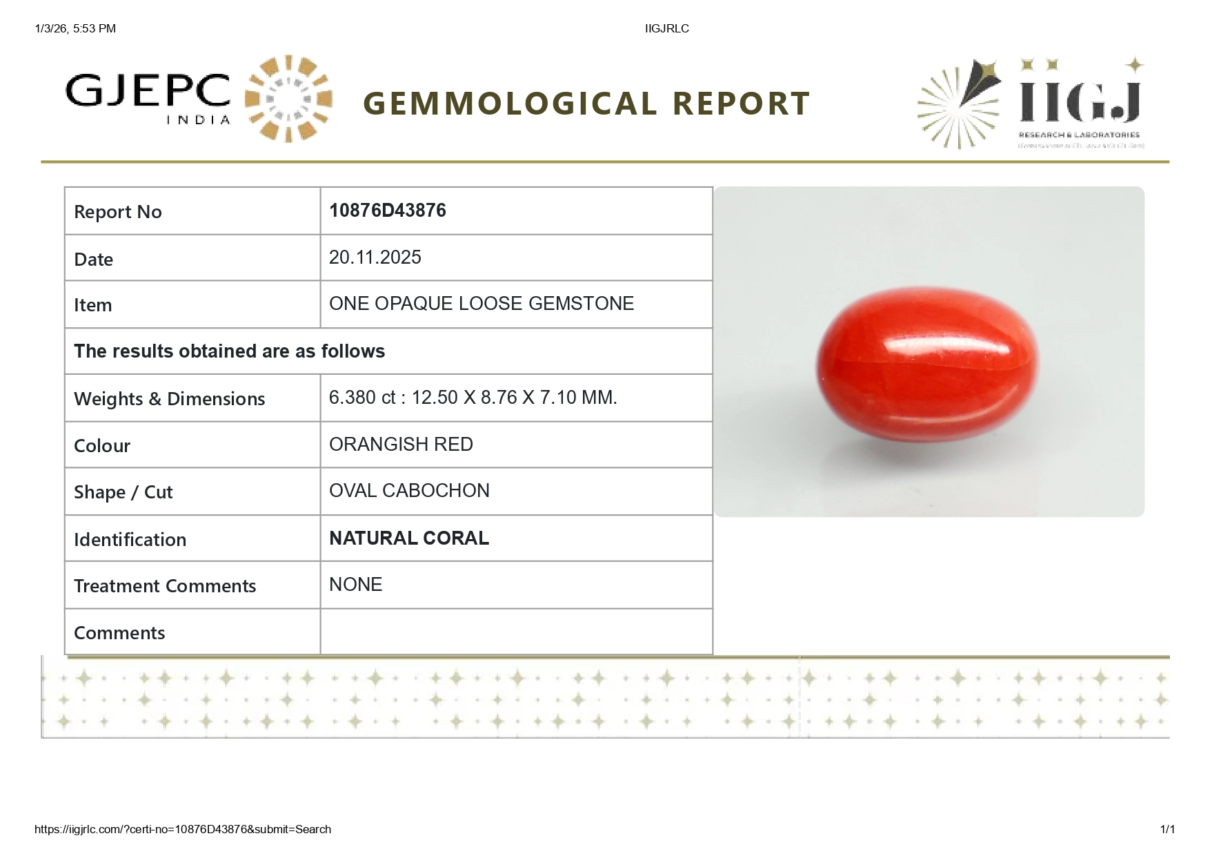 Buy 6.38 carats (7.01 Ratti) 100% natural Italian red coral (Moonga) stone online, directly imported from Italy (also called available"Italian Red Coral"). Moonga Stone is a source of enormous power & strength. Check out the exclusive inventory online all shapes (Triangular, Capsule & Oval) with a reputed IIGJ Certificate