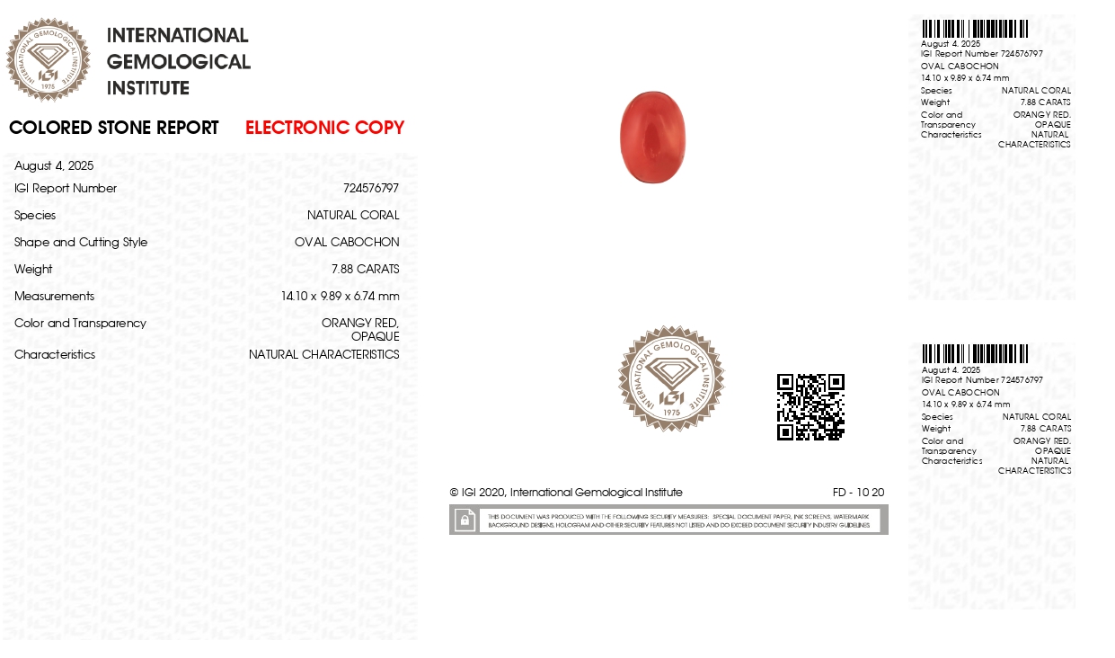 Buy 7.88 carats (8.66 Ratti) 100% natural Italian red coral (Moonga) stone online, directly imported from Italy (also called available"Italian Red Coral"). Moonga Stone is a source of enormous power & strength. Check out the exclusive inventory online all shapes (Triangular, Capsule & Oval) with a reputed IGI Certificate