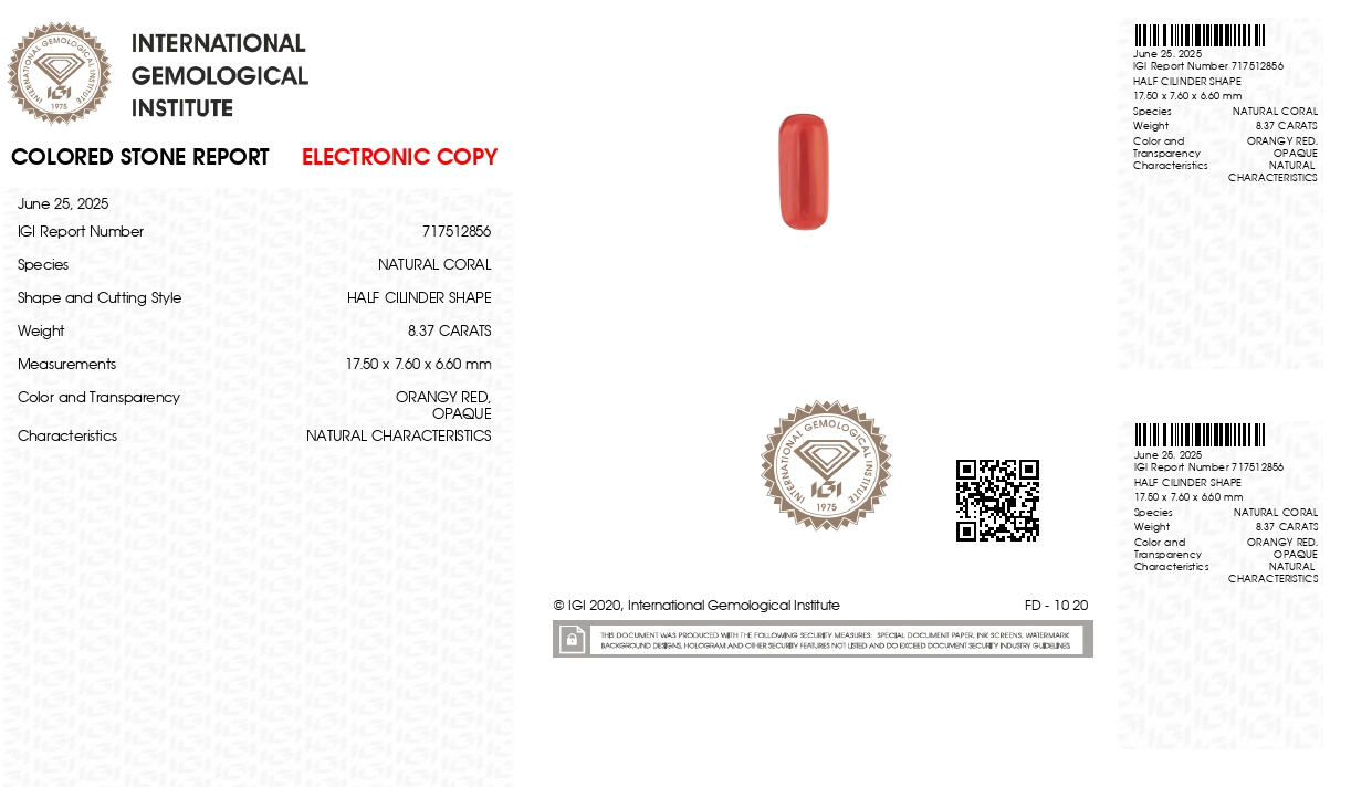 Buy 8.37 carats (9.20 Ratti) 100% natural Italian red coral (Moonga) stone online, directly imported from Italy (also called available"Italian Red Coral"). Moonga Stone is a source of enormous power & strength. Check out the exclusive inventory online all shapes (Triangular, Capsule & Oval) with a reputed IGI Certificate