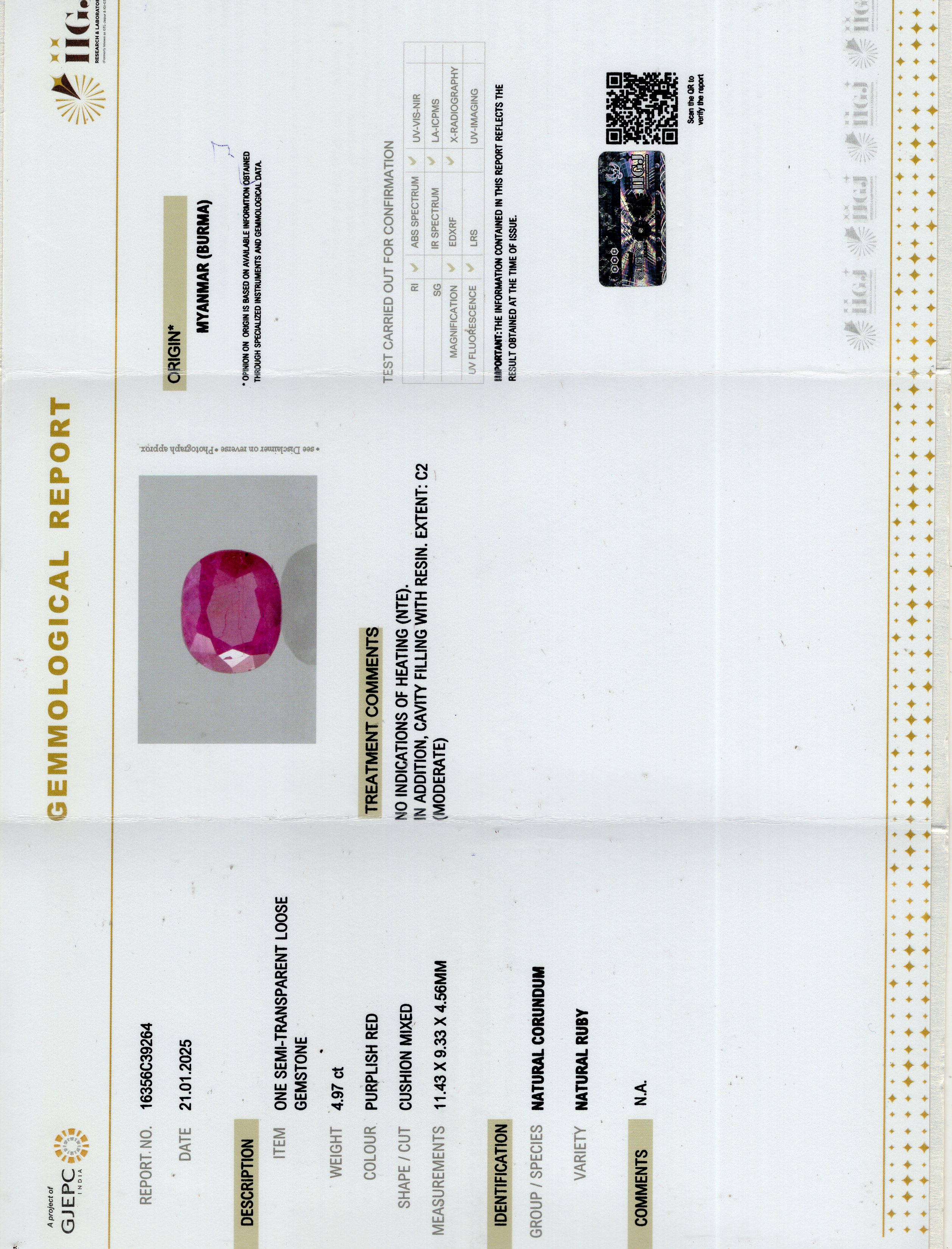 Buy one beautiful semi-transparent 4.97 ct/ 5.46 Ratti Original Ruby. It has a cushion shape, and a clarity grade of eye clean (evaluated at eye level), Pinkish-Red Color intensity, and an excellent polish. The origin of this ruby is Burma. This stone is unheated & untreated and certified from IIGJ Lab.