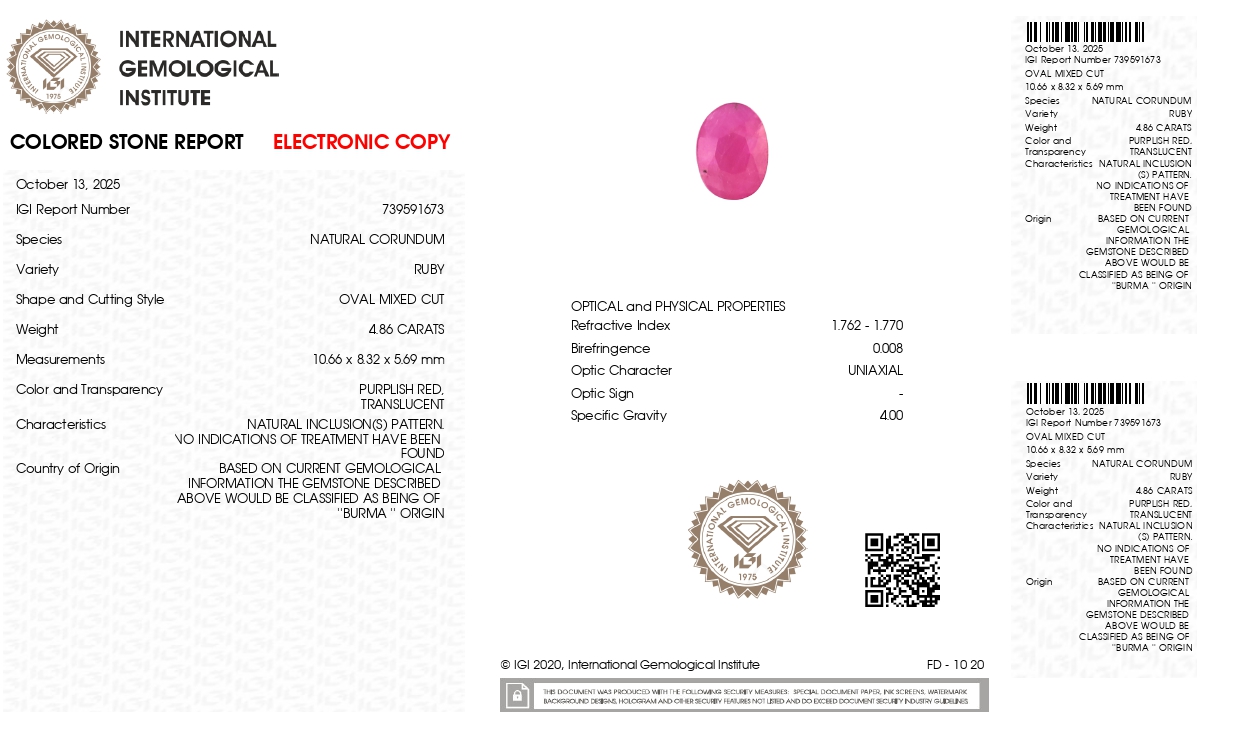 Buy one beautiful translucent 4.86 ct/ 5.34 Ratti Original Ruby. It has a oval shape, and a clarity grade of eye clean (evaluated at eye level), Purplish-Red Color intensity, and an excellent polish. The origin of this ruby is Burma. This stone is unheated & untreated and certified from IGI Lab.