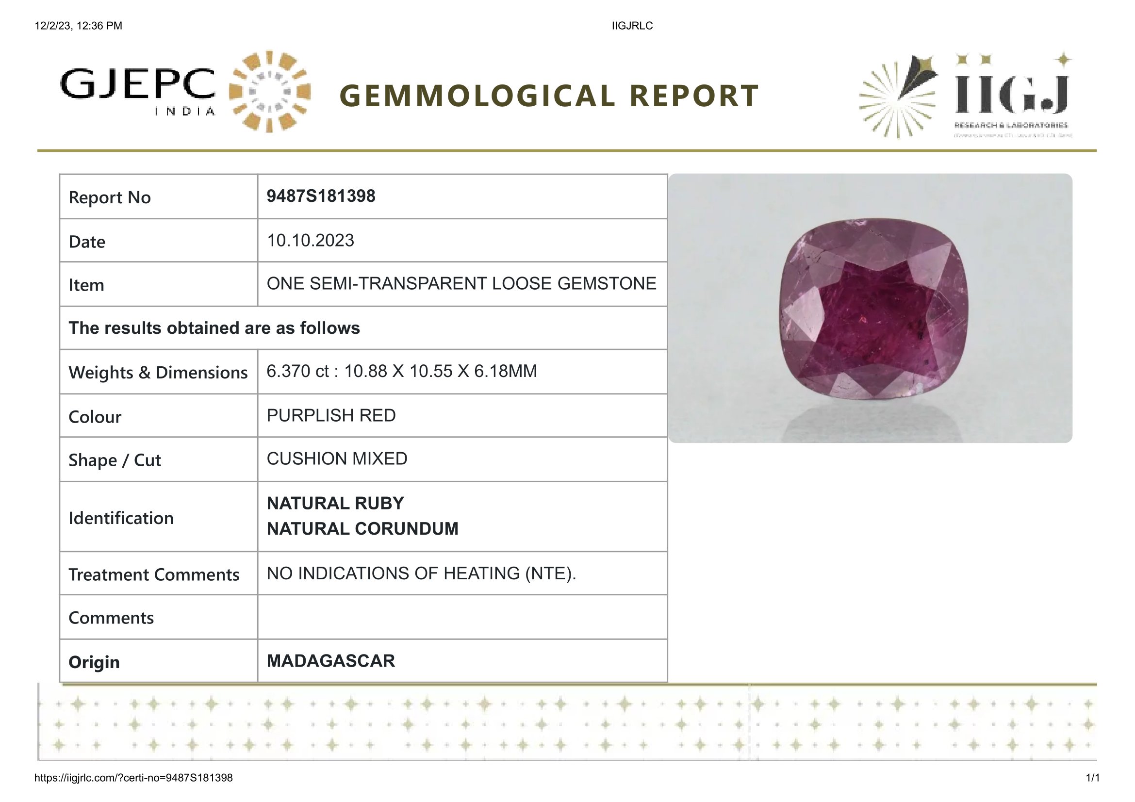 Buy one beautiful Transparent 6.37 ct/ 7.00 Ratti Original Ruby. It has a cushion shape, and a clarity grade of eye clean (evaluated at eye level), red Color intensity, and an excellent polish. The origin of this ruby is Madagascar. This stone is unheated & untreated and certified from IIGJ Lab.