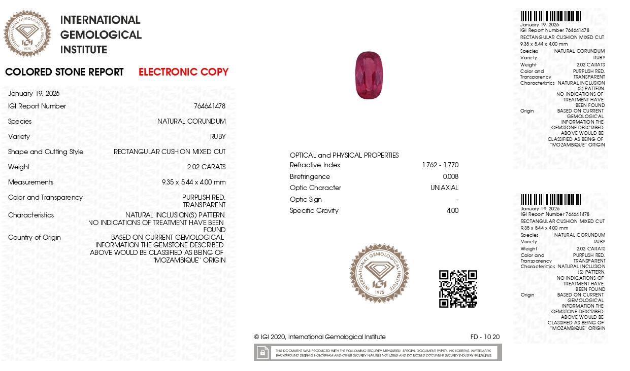 Buy one beautiful transparent 2.02 ct /2.22 Ratti Original Ruby stone. It has a rectangular cushion shape, and a clarity grade of eye clean (evaluated at eye level), Purplish-Red Color intensity, and an excellent polish. The origin of this ruby is Mozambique. This stone is unheated & untreated and certified from IGI Lab.