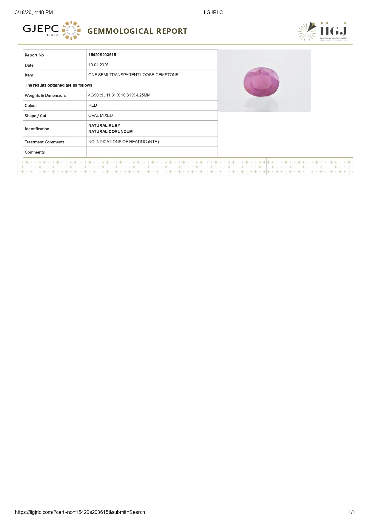 Buy one beautiful 4.69 ct/ 5.15 Ratti Original Ruby. It has a oval shape, and a clarity grade of eye clean (evaluated at eye level), Red Color intensity, and an excellent polish. The origin of this ruby is Africa. This stone is unheated & untreated and certified from IIGJ Govt. Lab.