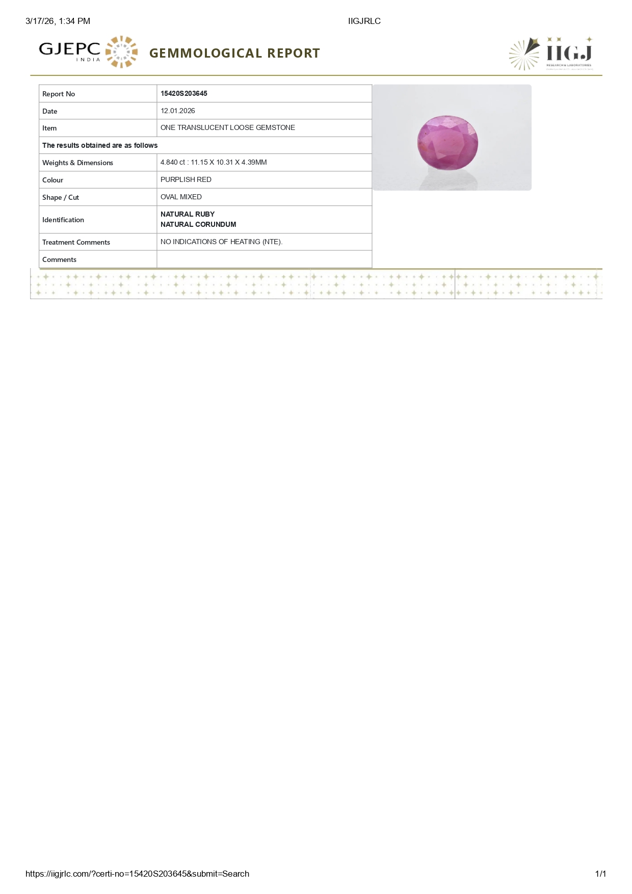 Buy one beautiful 4.84 ct/ 5.32 Ratti Original Ruby. It has a oval shape, and a clarity grade of eye clean (evaluated at eye level), Purplish-Red Color intensity, and an excellent polish. The origin of this ruby is Africa. This stone is unheated & untreated and certified from IIGJ Govt. Lab.