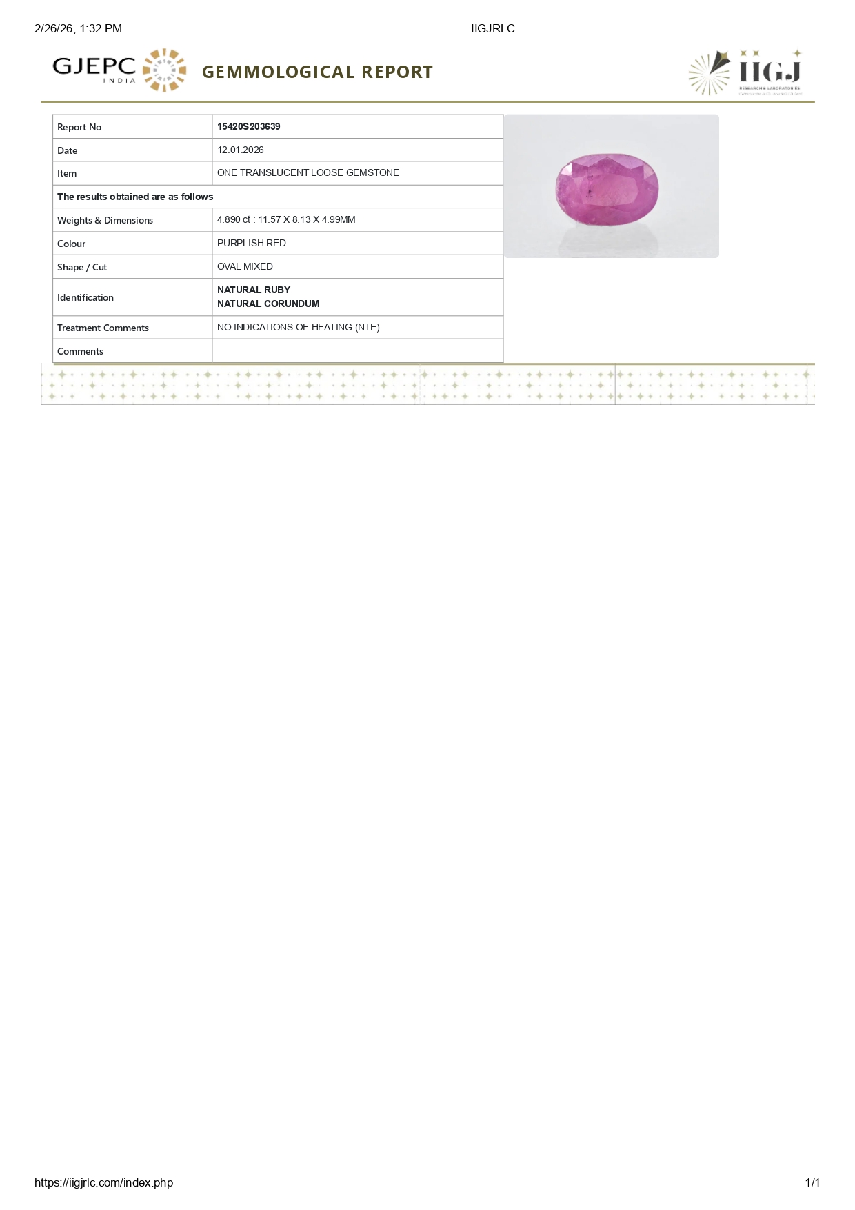 Buy one beautiful 4.89 ct/5.37 Ratti Original Ruby. It has a oval shape, and a clarity grade of eye clean (evaluated at eye level), Purplish-Red Color intensity, and an excellent polish. The origin of this ruby is Africa. This stone is unheated & untreated and certified from IIGJ Govt. Lab.