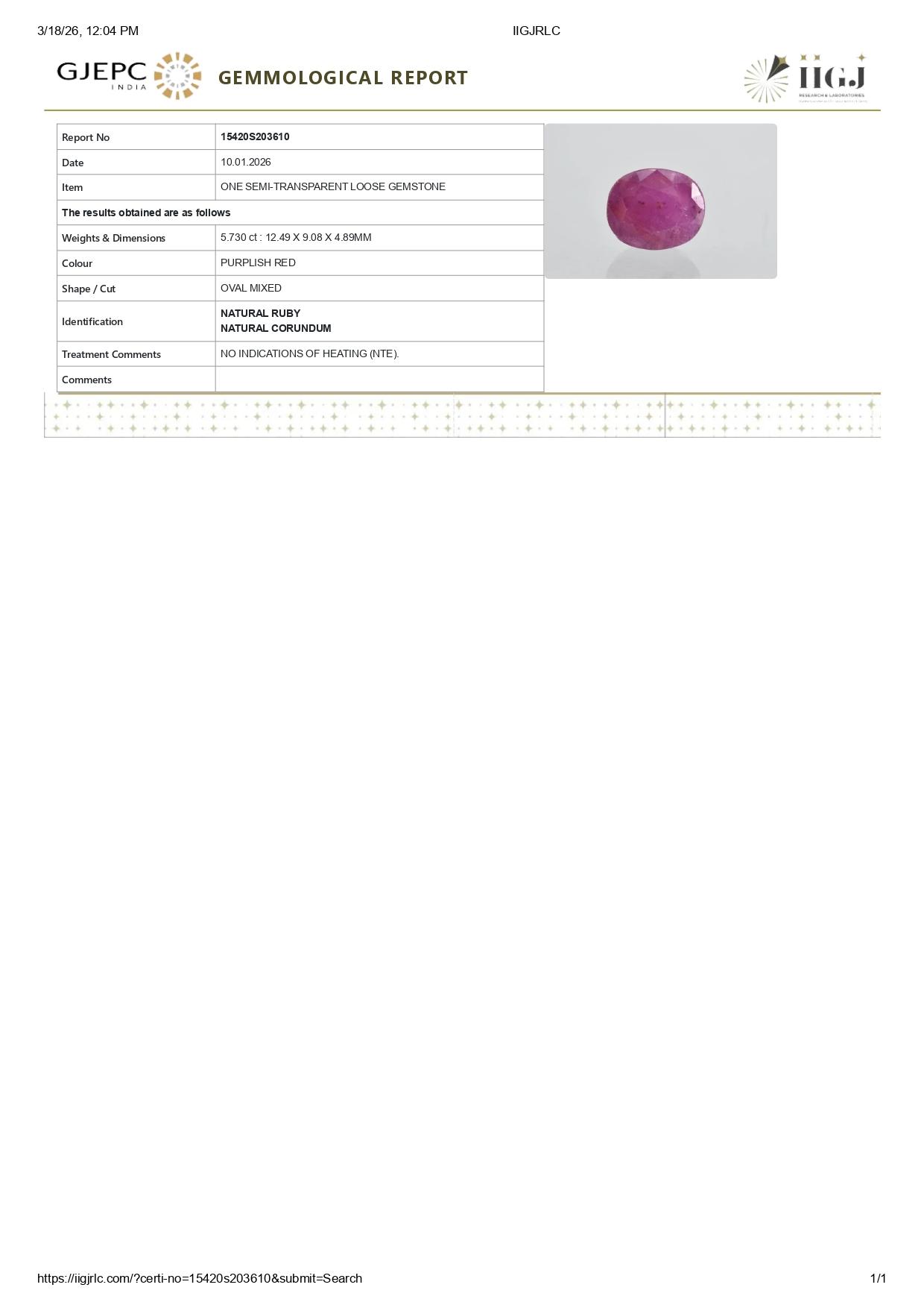 Buy one beautiful 5.73 ct/ 6.30 Ratti Original Ruby. It has a oval shape, and a clarity grade of eye clean (evaluated at eye level), Purplish-Red Color intensity, and an excellent polish. The origin of this ruby is Africa. This stone is unheated & untreated and certified from IIGJ Govt. Lab.