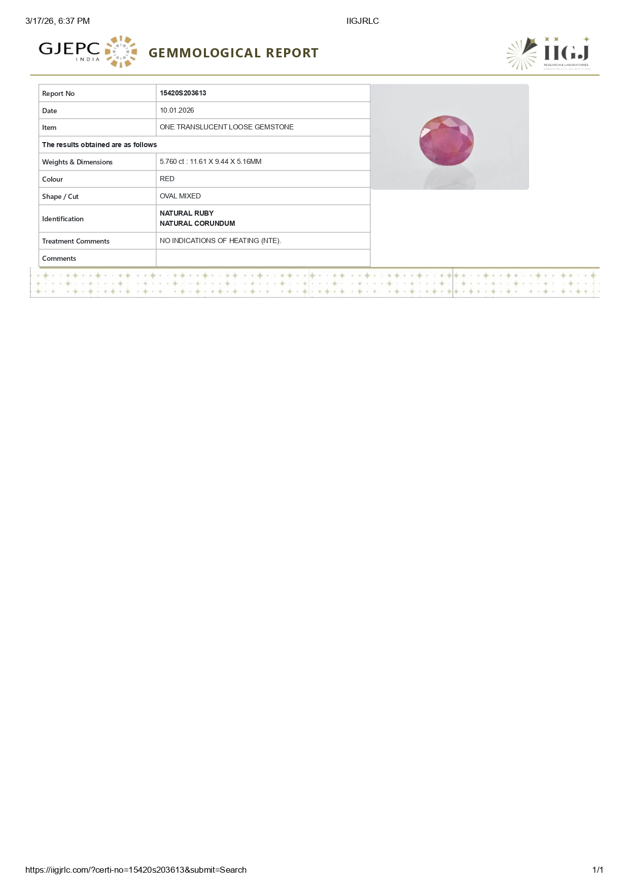 Buy one beautiful 5.76 ct/ 6.33 Ratti Original Ruby. It has a oval shape, and a clarity grade of eye clean (evaluated at eye level), Purplish-Red Color intensity, and an excellent polish. The origin of this ruby is Africa. This stone is unheated & untreated and certified from IIGJ Govt. Lab.