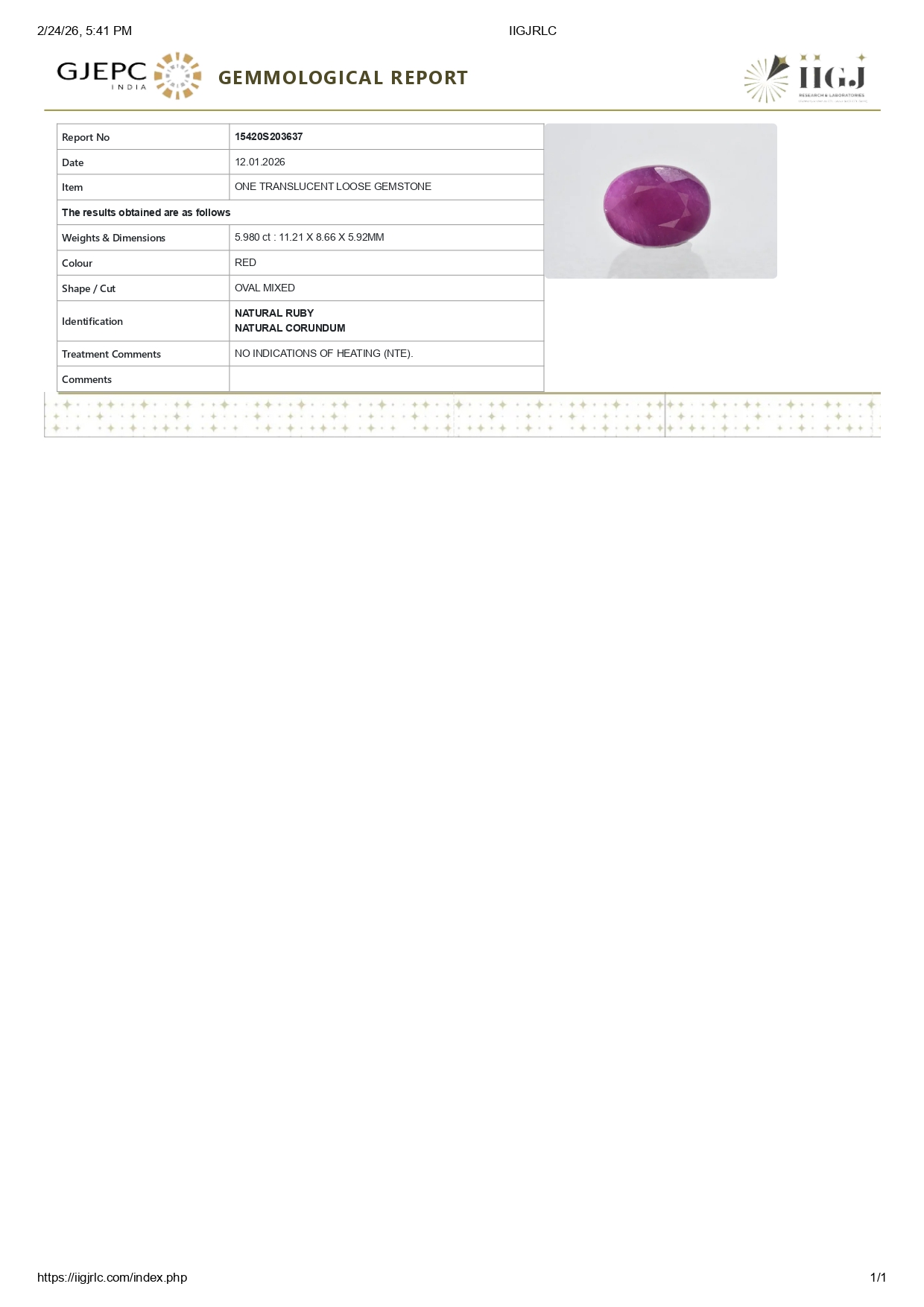 Buy one beautiful Translucent 5.98 ct/5.47 Ratti Original Ruby. It has a oval shape, and a clarity grade of eye clean (evaluated at eye level), Red Color intensity, and an excellent polish. The origin of this ruby is Africa. This stone is unheated & untreated and certified from IIGJ Govt. Lab.