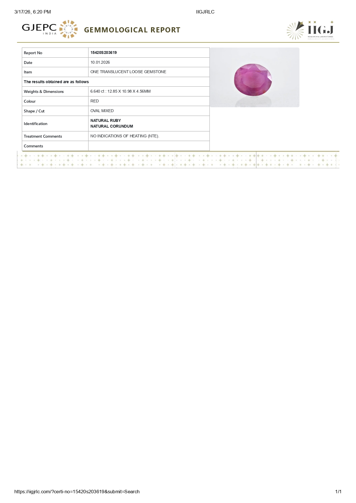 Buy one beautiful 6.64 ct/ 7.30 Ratti Original Ruby. It has a oval shape, and a clarity grade of eye clean (evaluated at eye level), Red Color intensity, and an excellent polish. The origin of this ruby is Africa. This stone is unheated & untreated and certified from IIGJ Govt. Lab.