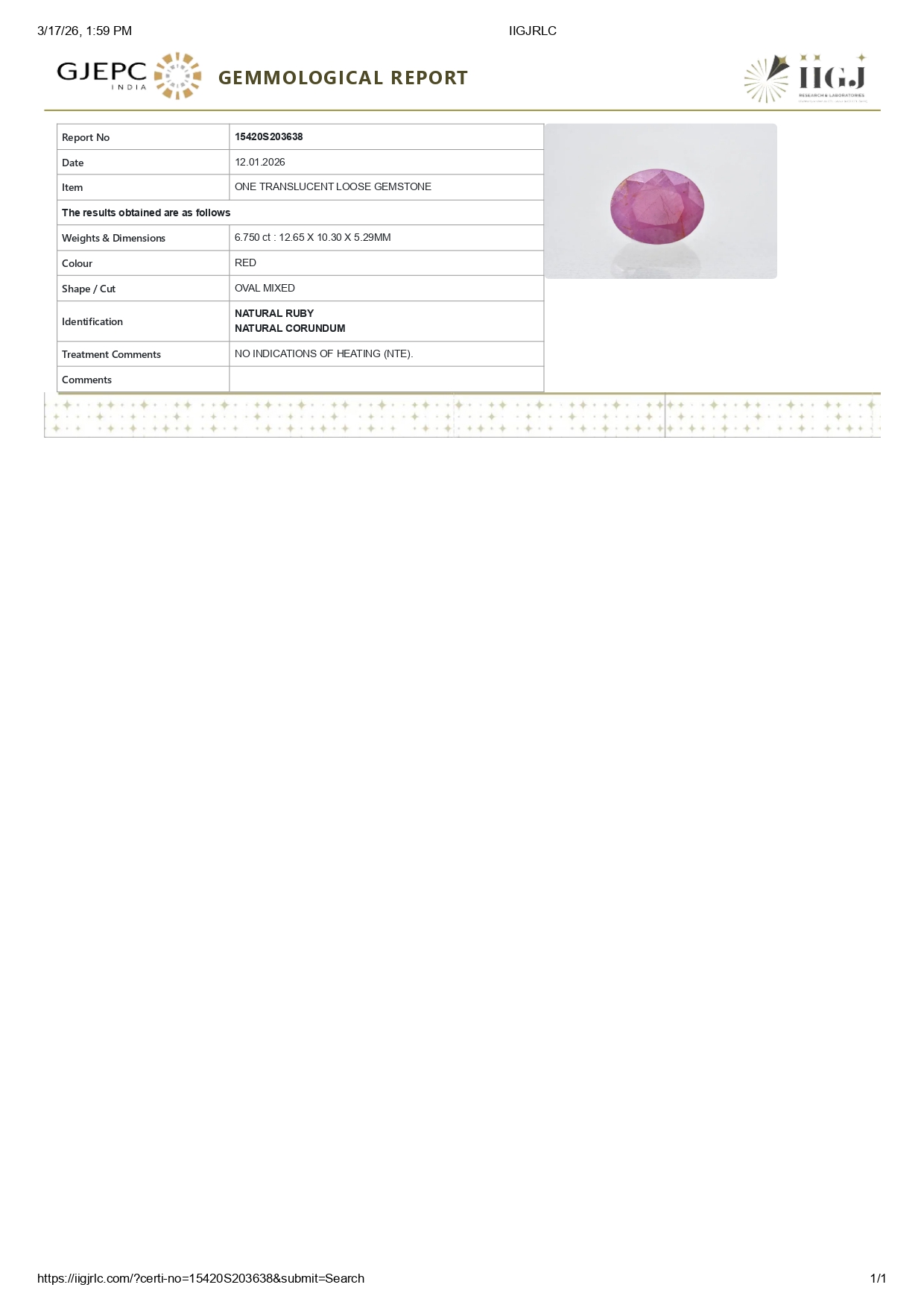 Buy one beautiful 6.75 ct/ 7.42 Ratti Original Ruby. It has a oval shape, and a clarity grade of eye clean (evaluated at eye level), Red Color intensity, and an excellent polish. The origin of this ruby is Africa. This stone is unheated & untreated and certified from IIGJ Govt. Lab.