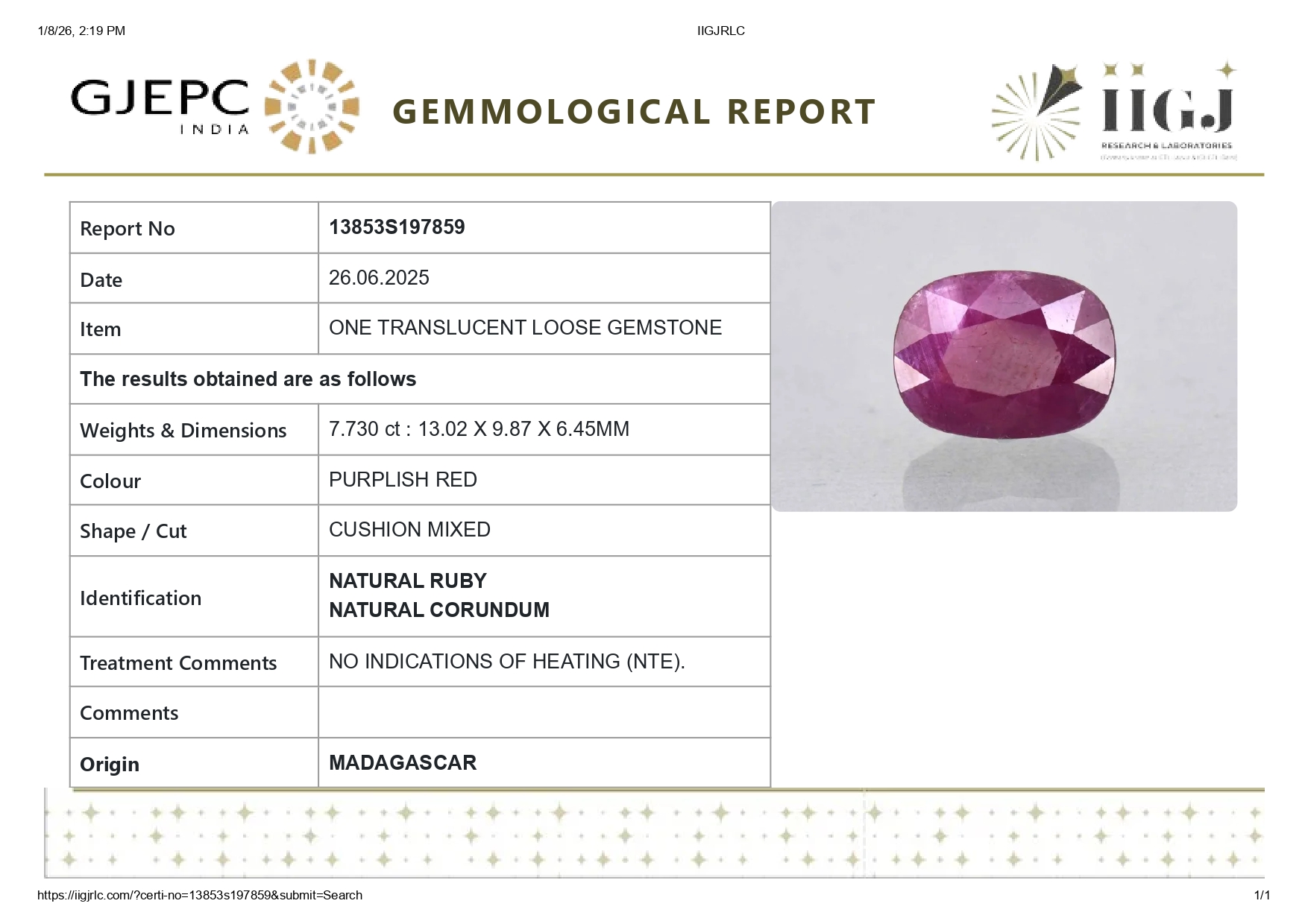 Buy one beautiful Translucent 7.73 ct/ 8.49 Ratti Original Ruby. It has cushion a shape, and a clarity grade of eye clean (evaluated at eye level), Purplish-Red Color intensity, and an excellent polish. The origin of this ruby is Madagascar. This stone is unheated & untreated and certified from IIGJ Lab.