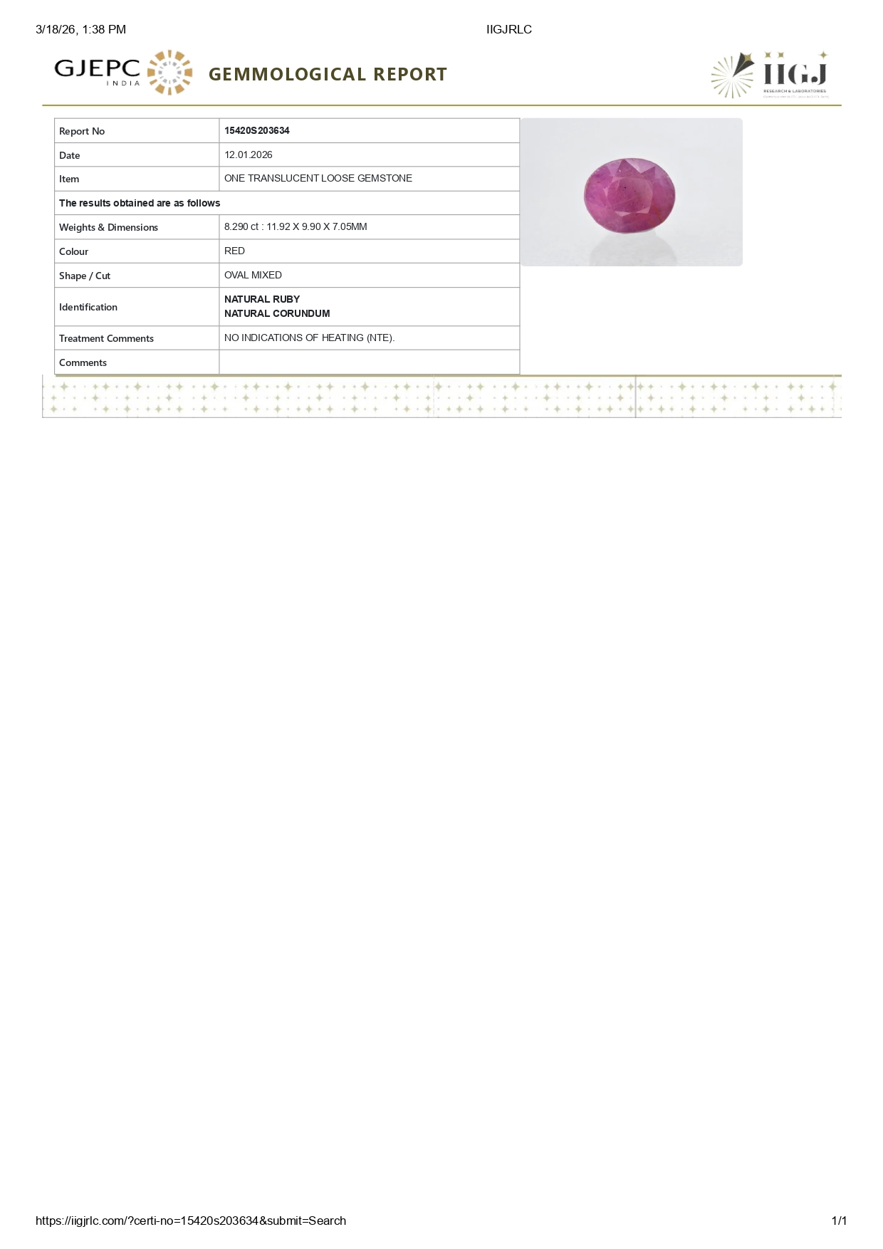Buy one beautiful 8.29 ct/ 9.11 Ratti Original Ruby. It has a oval shape, and a clarity grade of eye clean (evaluated at eye level), Purplish-Red Color intensity, and an excellent polish. The origin of this ruby is Africa. This stone is unheated & untreated and certified from IIGJ Govt. Lab.