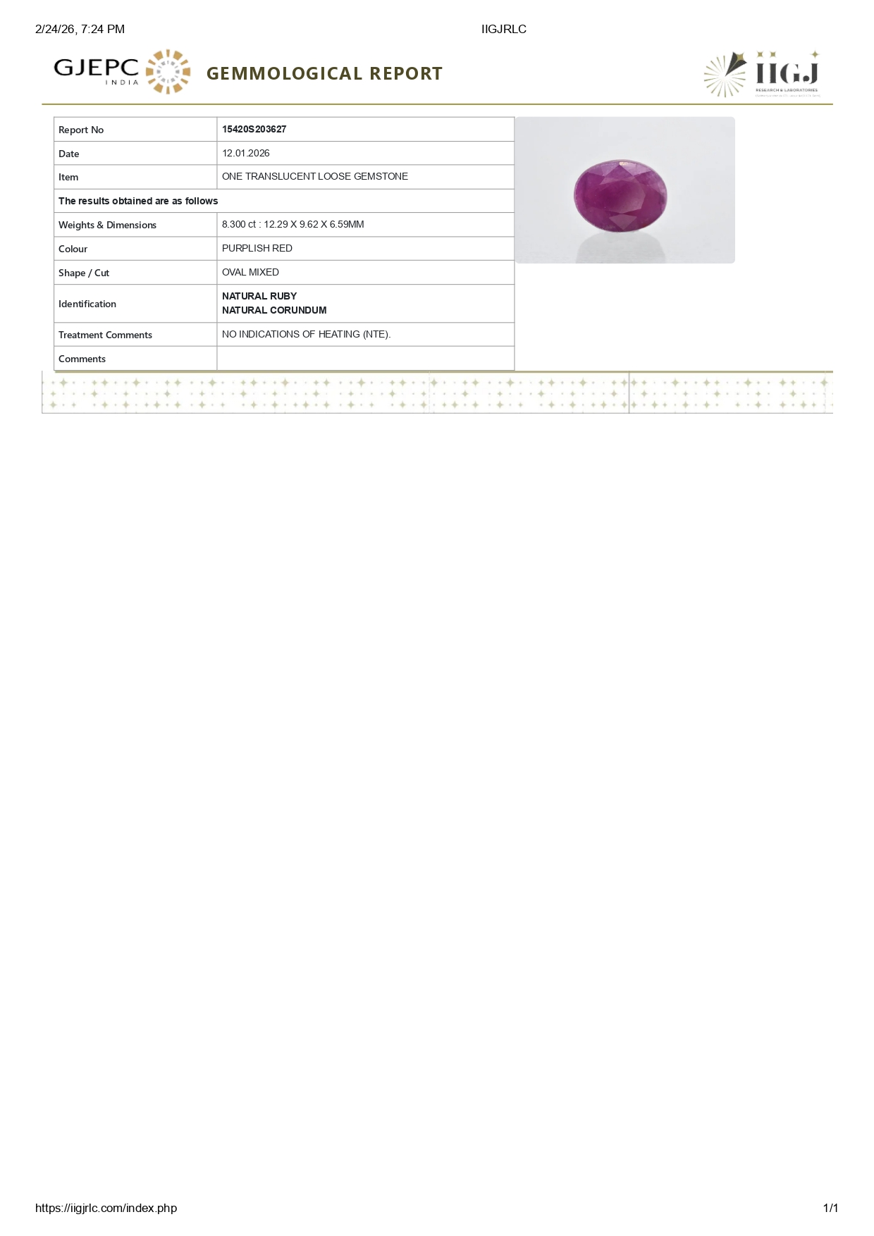 Buy one beautiful Translucent 8.30 ct/9.12 Ratti Original Ruby. It has a oval shape, and a clarity grade of eye clean (evaluated at eye level), Purplish-Red Color intensity, and an excellent polish. The origin of this ruby is Africa. This stone is unheated & untreated and certified from IIGJ Govt. Lab.
