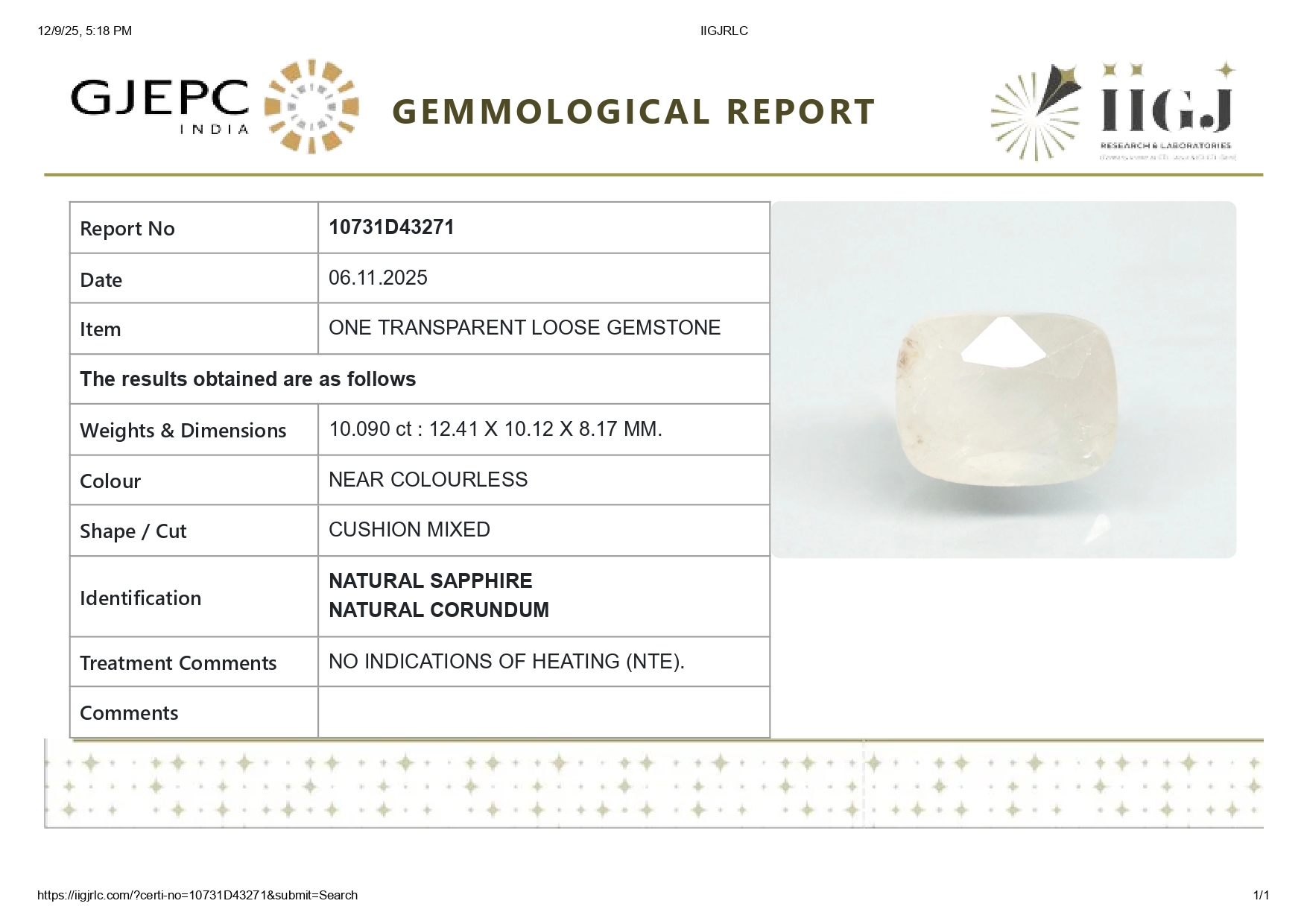 Buy 10.09 Carats (11.09 Ratti) original, unheated & untreated White Sapphire (Safed Pukhraj) for sale online. This white sapphire is imported from ceylon or sri-lankan mines. That's why it is also known as "Ceylon or Sri-Lankan White Sapphire. A white sapphire has many benefits and specially recommended for Business, Finance, Career, Marriage, Child Conceive & many more. All real white sapphire stones are certified from IIGJ/IGI govt labs. Actual photos, videos and certificates can be seen online here.