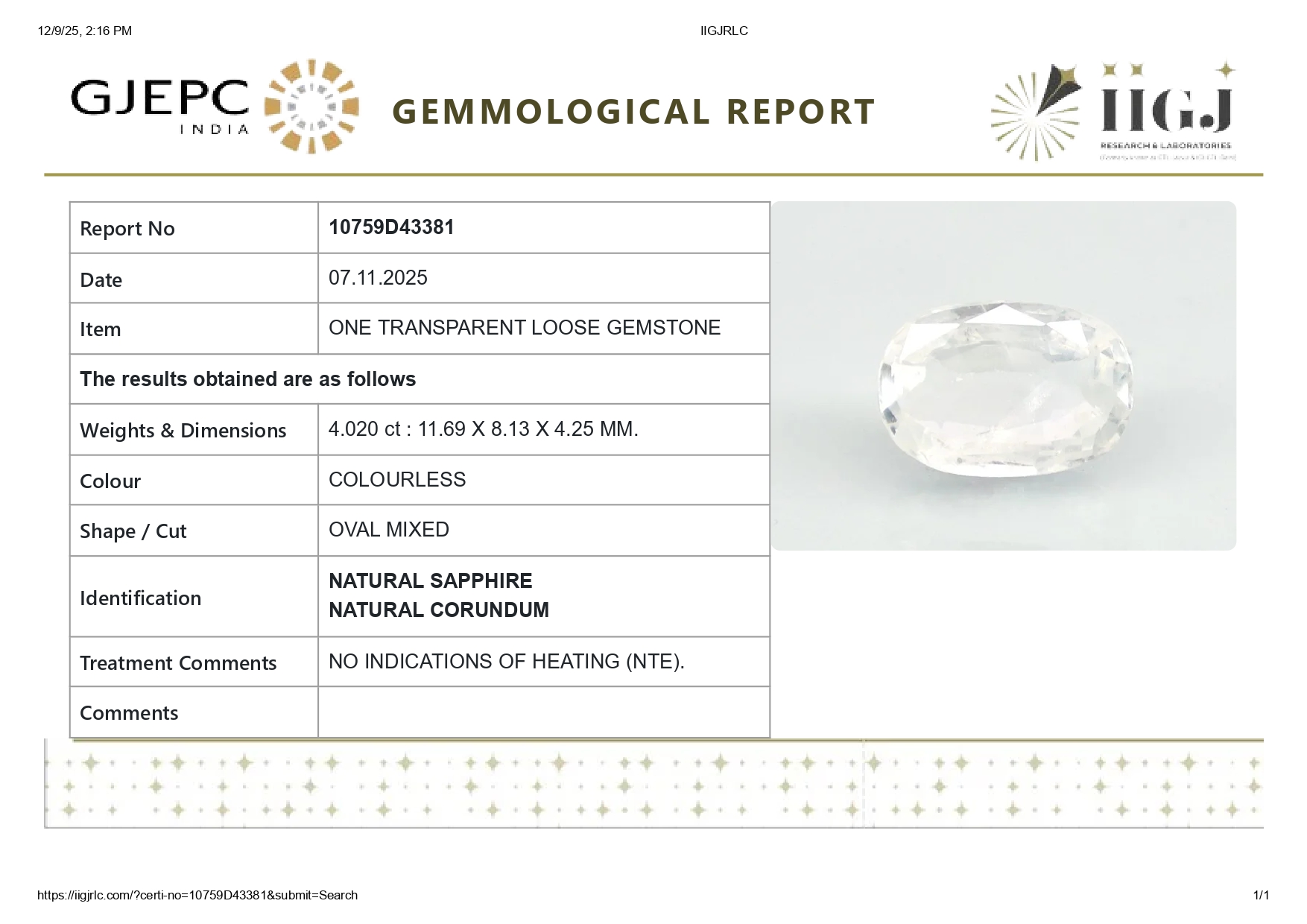 Buy 4.02 Carats (4.42 Ratti) original, unheated & untreated White Sapphire (Safed Pukhraj) for sale online. This white sapphire is imported from ceylon or sri-lankan mines. That's why it is also known as "Ceylon or Sri-Lankan White Sapphire. A white sapphire has many benefits and specially recommended for Business, Finance, Career, Marriage, Child Conceive & many more. All real white sapphire stones are certified from IIGJ/IGI govt labs. Actual photos, videos and certificates can be seen online here.