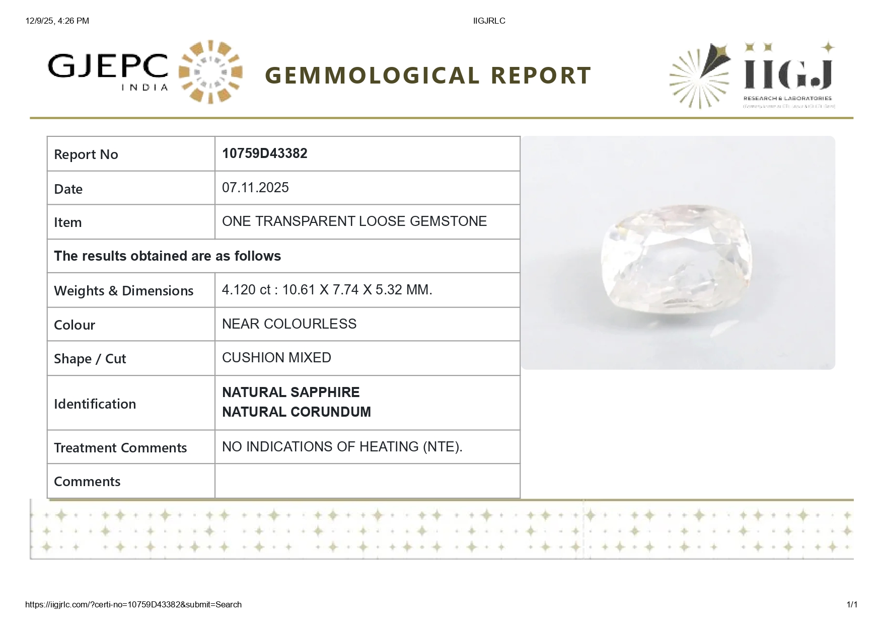 Buy 4.12 Carats (4.53 Ratti) original, unheated & untreated White Sapphire (Safed Pukhraj) for sale online. This white sapphire is imported from ceylon or sri-lankan mines. That's why it is also known as "Ceylon or Sri-Lankan White Sapphire. A white sapphire has many benefits and specially recommended for Business, Finance, Career, Marriage, Child Conceive & many more. All real white sapphire stones are certified from IIGJ/IGI govt labs. Actual photos, videos and certificates can be seen online here.