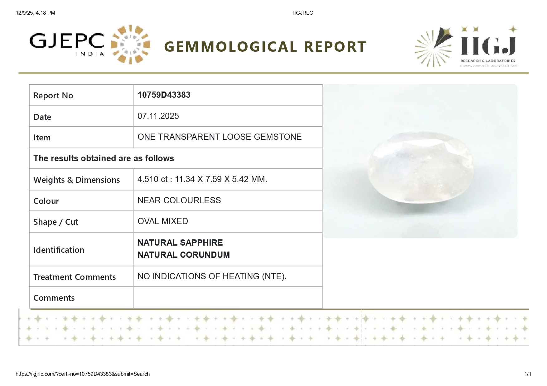 Buy 4.51 Carats (4.96 Ratti) original, unheated & untreated White Sapphire (Safed Pukhraj) for sale online. This white sapphire is imported from ceylon or sri-lankan mines. That's why it is also known as "Ceylon or Sri-Lankan White Sapphire. A white sapphire has many benefits and specially recommended for Business, Finance, Career, Marriage, Child Conceive & many more. All real white sapphire stones are certified from IIGJ/IGI govt labs. Actual photos, videos and certificates can be seen online here.