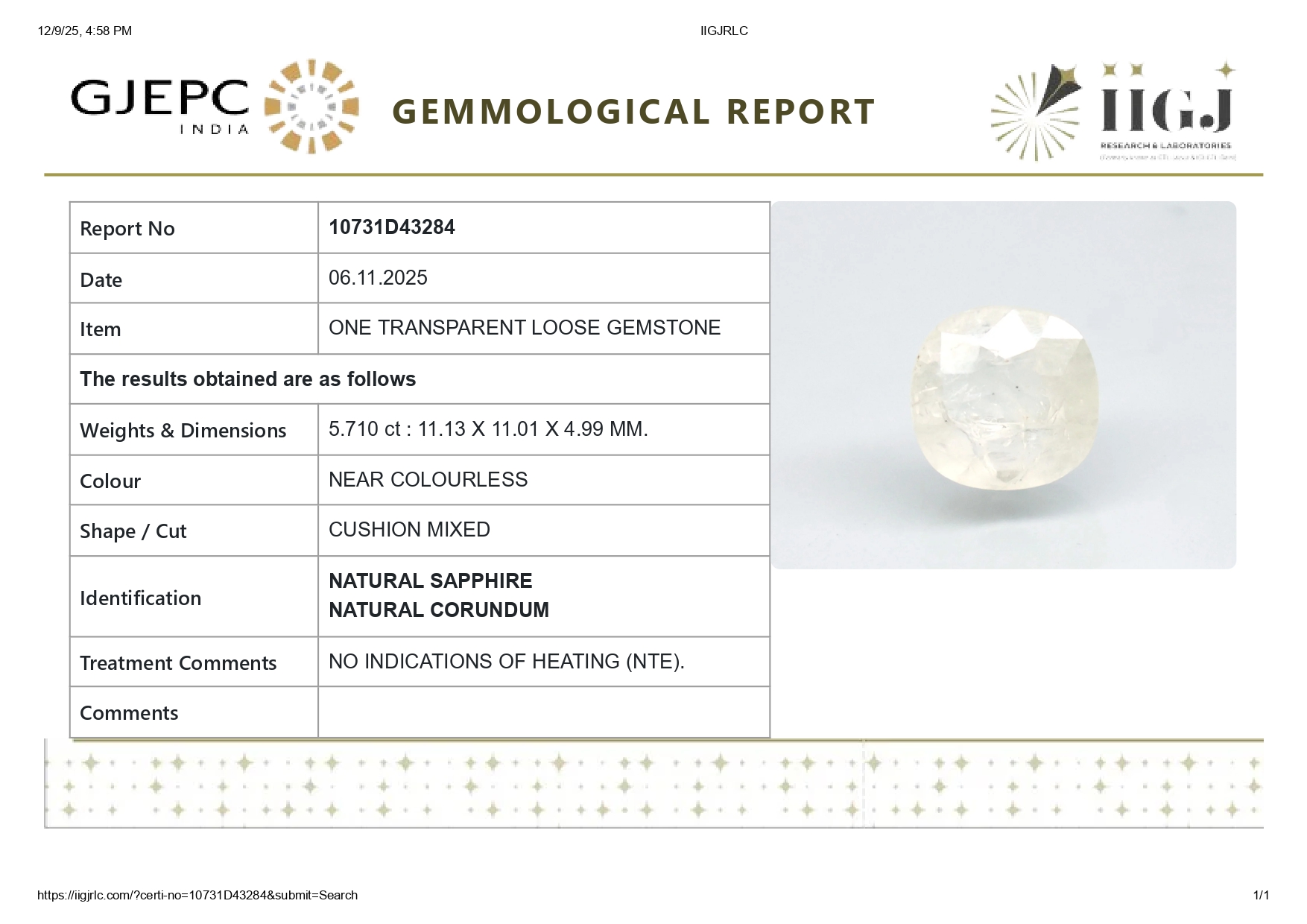 Buy 5.71 Carats (6.27 Ratti) original, unheated & untreated White Sapphire (Safed Pukhraj) for sale online. This white sapphire is imported from ceylon or sri-lankan mines. That's why it is also known as "Ceylon or Sri-Lankan White Sapphire. A white sapphire has many benefits and specially recommended for Business, Finance, Career, Marriage, Child Conceive & many more. All real white sapphire stones are certified from IIGJ/IGI govt labs. Actual photos, videos and certificates can be seen online here.