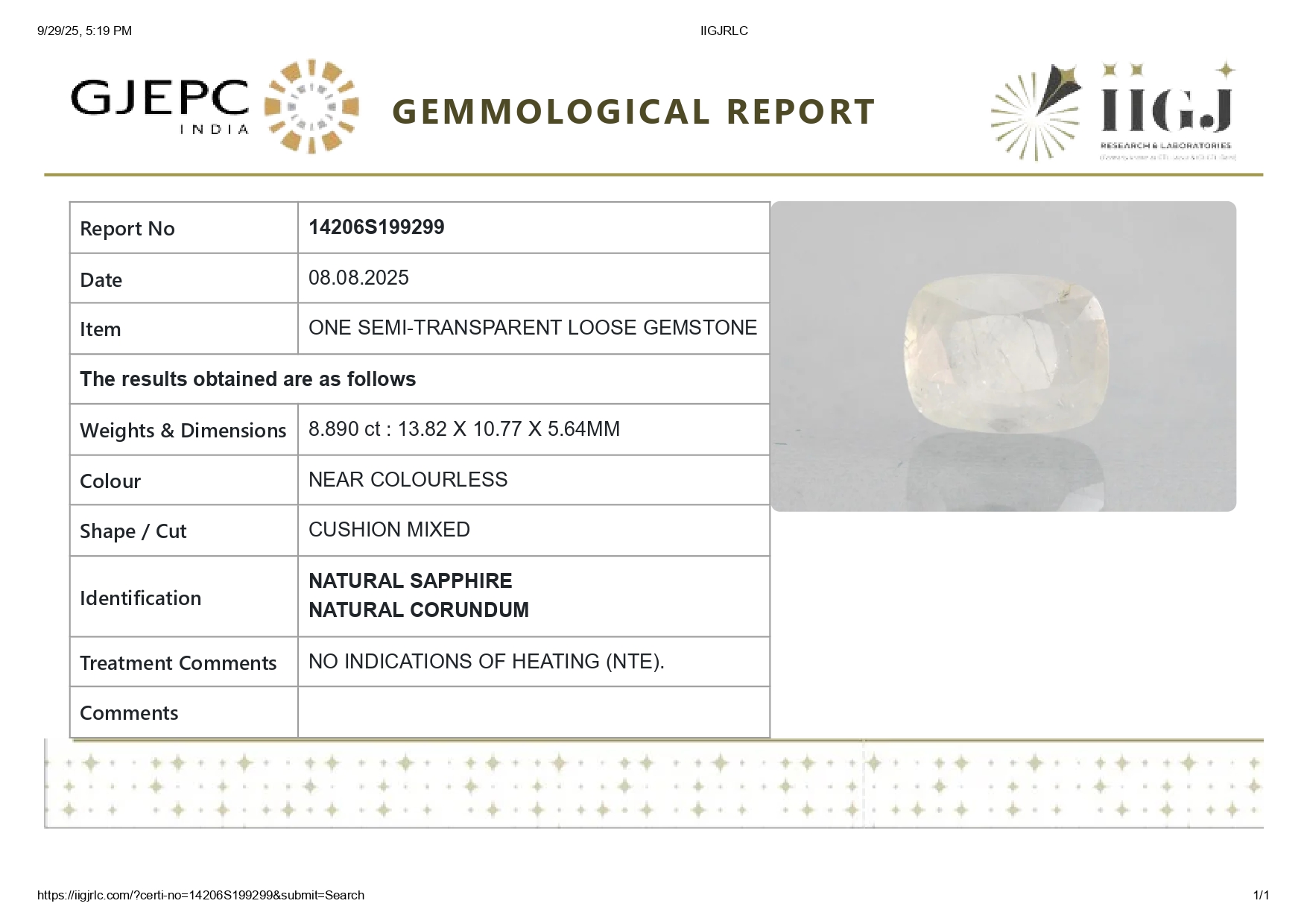 Buy 8.89 Carats (9.77 Ratti) original, unheated & untreated White Sapphire (Safed Pukhraj) for sale online. This white sapphire is imported from ceylon or sri-lankan mines. That's why it is also known as "Ceylon or Sri-Lankan White Sapphire. A white sapphire has many benefits and specially recommended for Business, Finance, Career, Marriage, Child Conceive & many more. All real white sapphire stones are certified from IIGJ/IGI govt labs. Actual photos, videos and certificates can be seen online here.