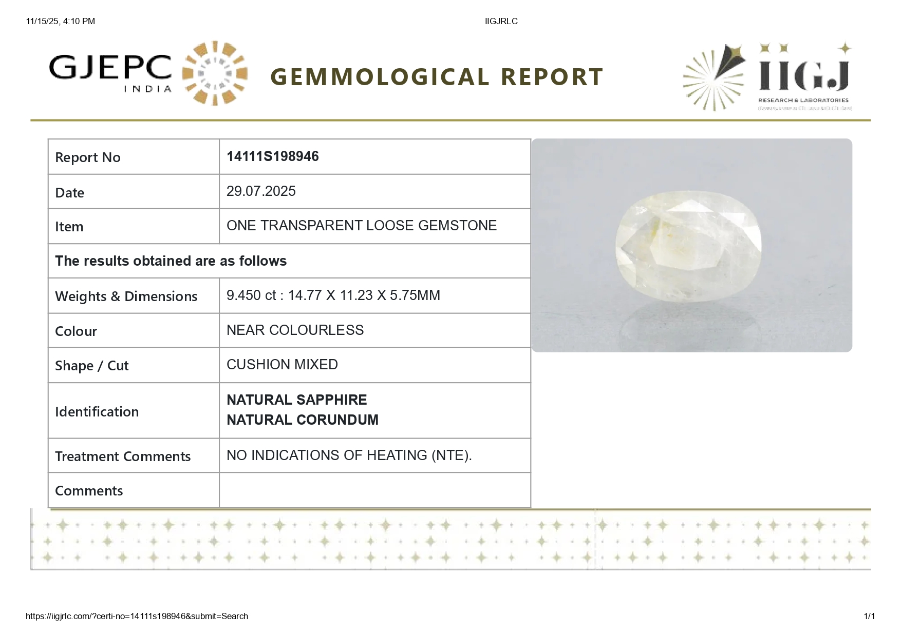 Buy 9.45 Carats (10.38 Ratti) original, unheated & untreated White Sapphire (Safed Pukhraj) for sale online. This white sapphire is imported from ceylon or sri-lankan mines. That's why it is also known as "Ceylon or Sri-Lankan White Sapphire. A white sapphire has many benefits and specially recommended for Business, Finance, Career, Marriage, Child Conceive & many more. All real white sapphire stones are certified from IIGJ/IGI govt labs. Actual photos, videos and certificates can be seen online here.
