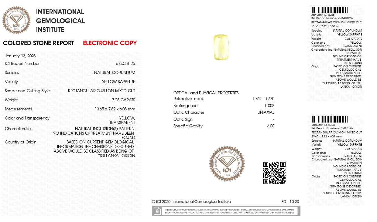 Buy one beautiful transparent 7.25 Carat/ 7.97 Ratti original yellow sapphire stone online with the dimensions of 13.65 x 7.82 x 6.08 mm. It has a rectangular cushion cut shape, and a clarity grade of eye clean (evaluated at eye level), with good color intensity. The origin of this real yellow sapphire(pukhraj) stone is Ceylon(Sri Lanka). This yellow sapphires is 100% unheated & untreated and certified from IGI Govt. Lab.