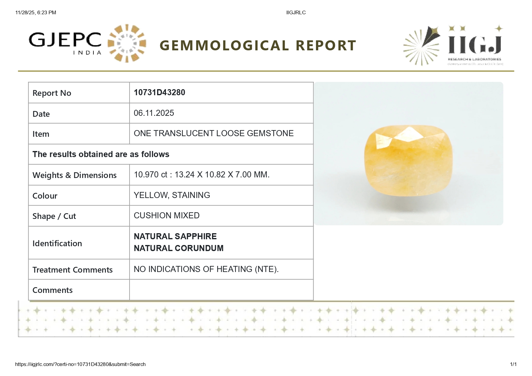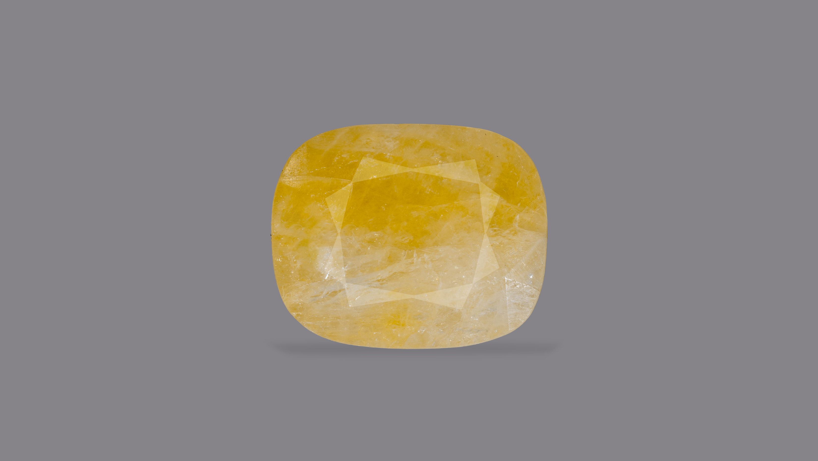 Buy one beautiful transparent 10.97 Carat/ 12.05 Ratti original yellow sapphire stone online.It has a cushion shape, and a clarity grade of eye clean (evaluated at eye level), with good color intensity. The origin of this real yellow sapphire(pukhraj) stone is Ceylon(Sri Lanka). This yellow sapphires is 100% unheated & untreated and certified from IIGJ Govt. Lab.