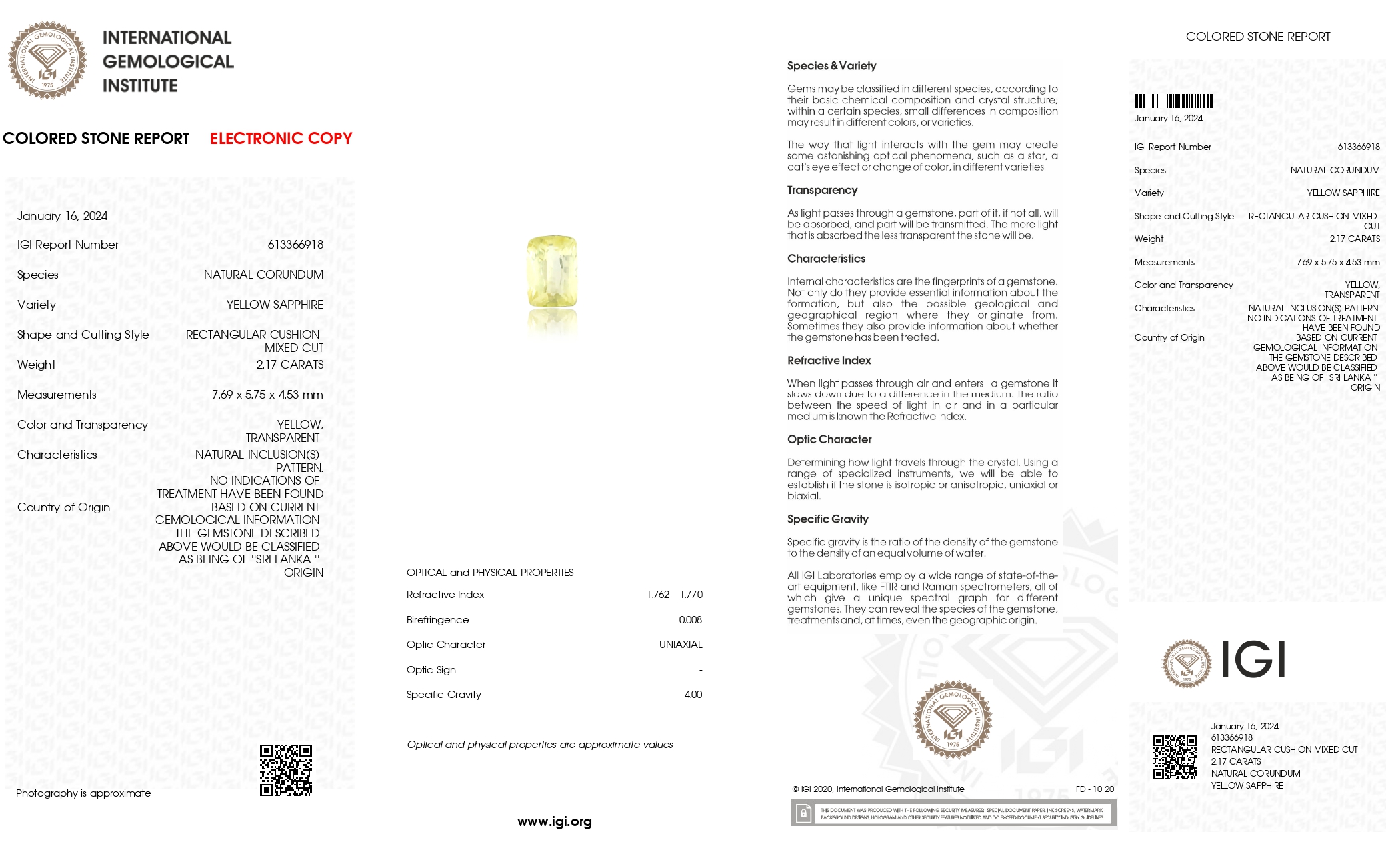 Buy one beautiful transparent 2.18 Carat/ 2.40 Ratti original yellow sapphire stone online.It has a rectangular cushion shape, and a clarity grade of eye clean (evaluated at eye level), with good color intensity. The origin of this real yellow sapphire(pukhraj) stone is Ceylon(Sri Lanka). This yellow sapphires is 100% unheated & untreated and certified from IGI Govt. Lab.