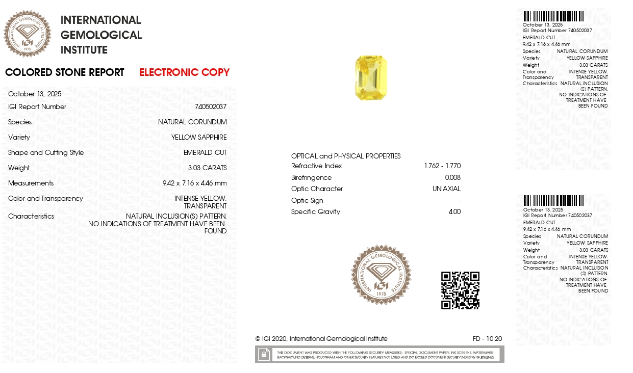 Buy one beautiful transparent 3.03 Carat/ 3.33 Ratti original yellow sapphire stone online.It has a emerald cut shape, and a clarity grade of eye clean (evaluated at eye level), with good color intensity. The origin of this real yellow sapphire(pukhraj) stone is Ceylon(Sri Lanka). This yellow sapphires is 100% unheated & untreated and certified from IGI Govt. Lab.