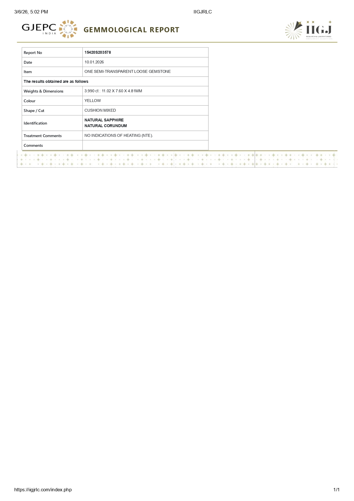 Buy one beautiful transparent 3.99 Carat/ 4.38 Ratti original yellow sapphire stone online.It has a Cushion shape, and a clarity grade of eye clean (evaluated at eye level), with good color intensity. The origin of this real yellow sapphire(pukhraj) stone is Ceylon(Sri Lanka). This yellow sapphires is 100% unheated & untreated and certified from IIGJ Lab.