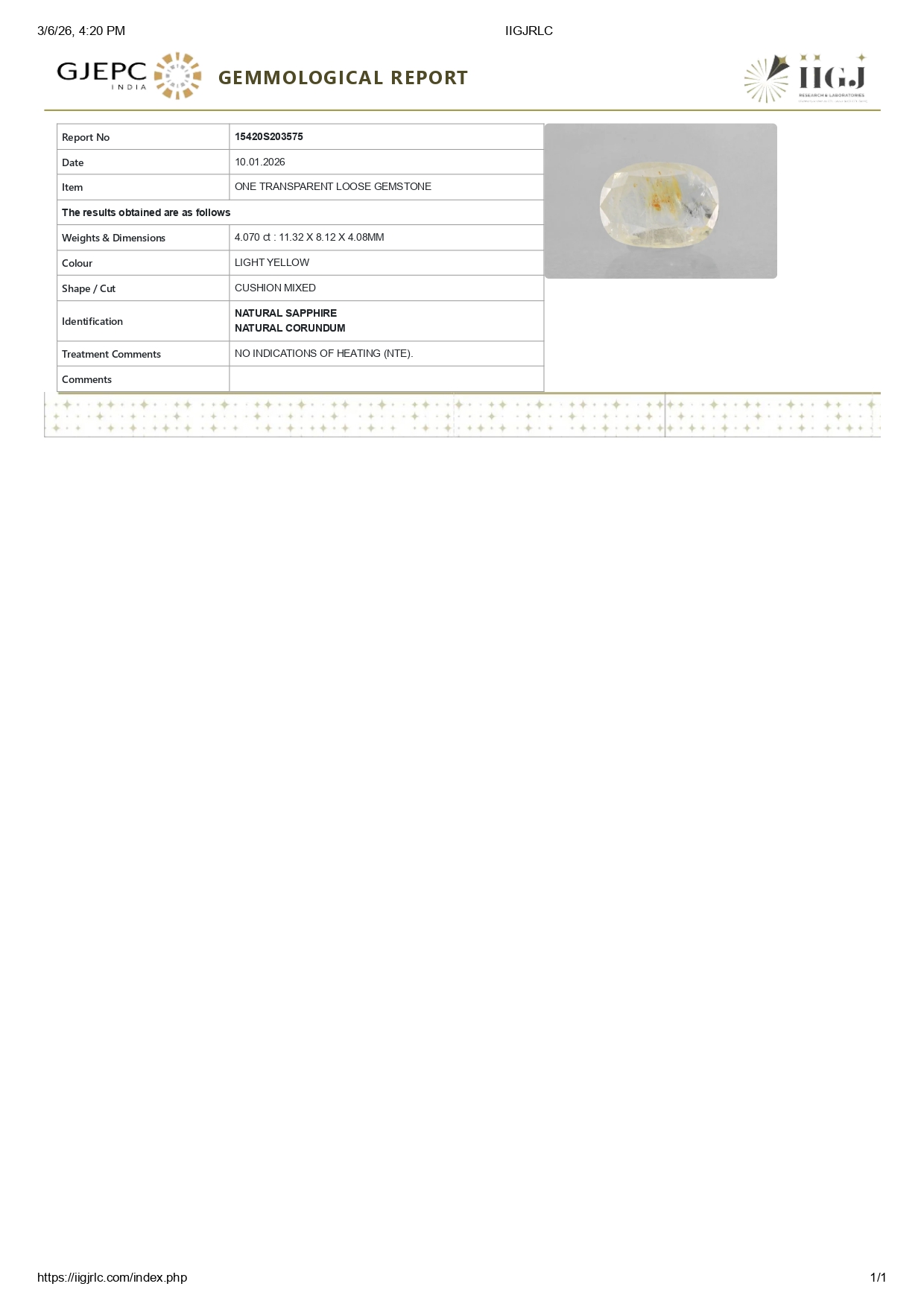 Buy one beautiful transparent 4.07 Carat/ 4.47 Ratti original yellow sapphire stone online.It has a Cushion shape, and a clarity grade of eye clean (evaluated at eye level), with good color intensity. The origin of this real yellow sapphire(pukhraj) stone is Ceylon(Sri Lanka). This yellow sapphires is 100% unheated & untreated and certified from IIGJ Lab.