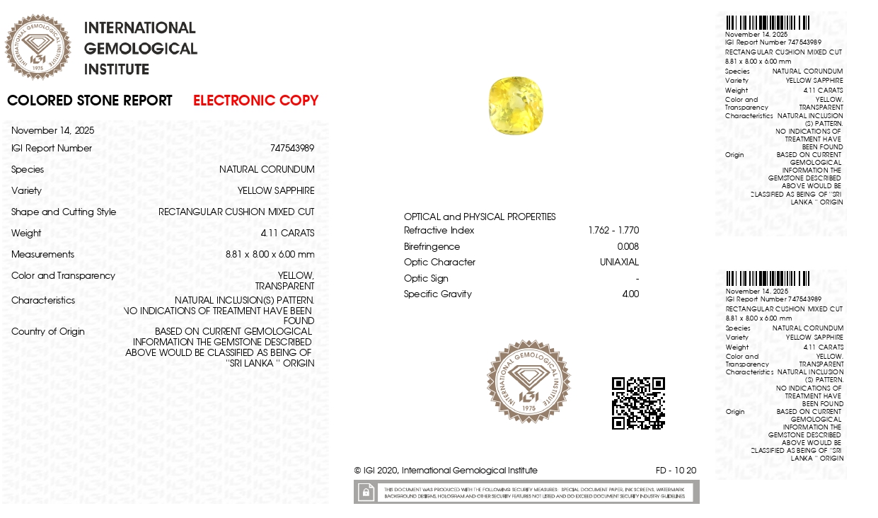 Buy one beautiful transparent 4.11 Carat/ 4.52 Ratti original yellow sapphire stone online.It has a rectangular cushion shape, and a clarity grade of eye clean (evaluated at eye level), with good color intensity. The origin of this real yellow sapphire(pukhraj) stone is Ceylon(Sri Lanka). This yellow sapphires is 100% unheated & untreated and certified from IGI Govt. Lab.