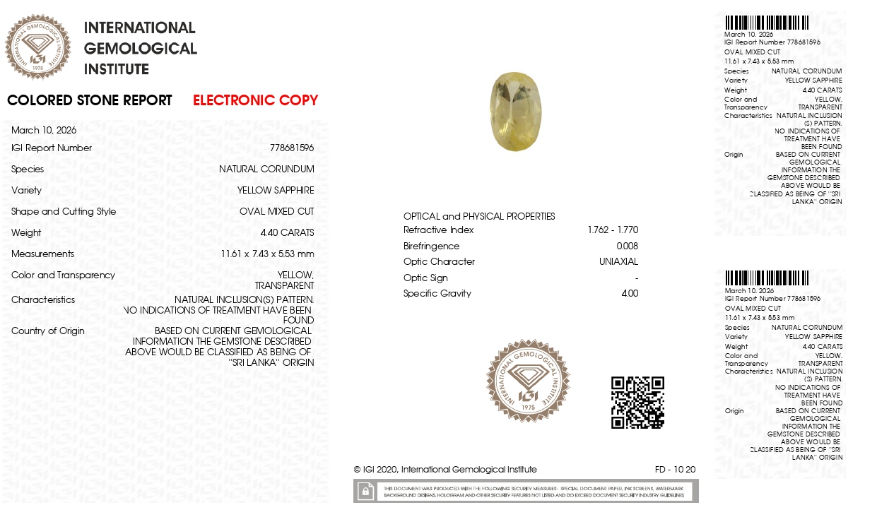 Buy one beautiful transparent 4.40 Carat/ 4.84 Ratti original yellow sapphire stone online.It has a Oval shape, and a clarity grade of eye clean (evaluated at eye level), with good color intensity. The origin of this real yellow sapphire(pukhraj) stone is Ceylon(Sri Lanka). This yellow sapphires is 100% unheated & untreated and certified from IGI Lab.