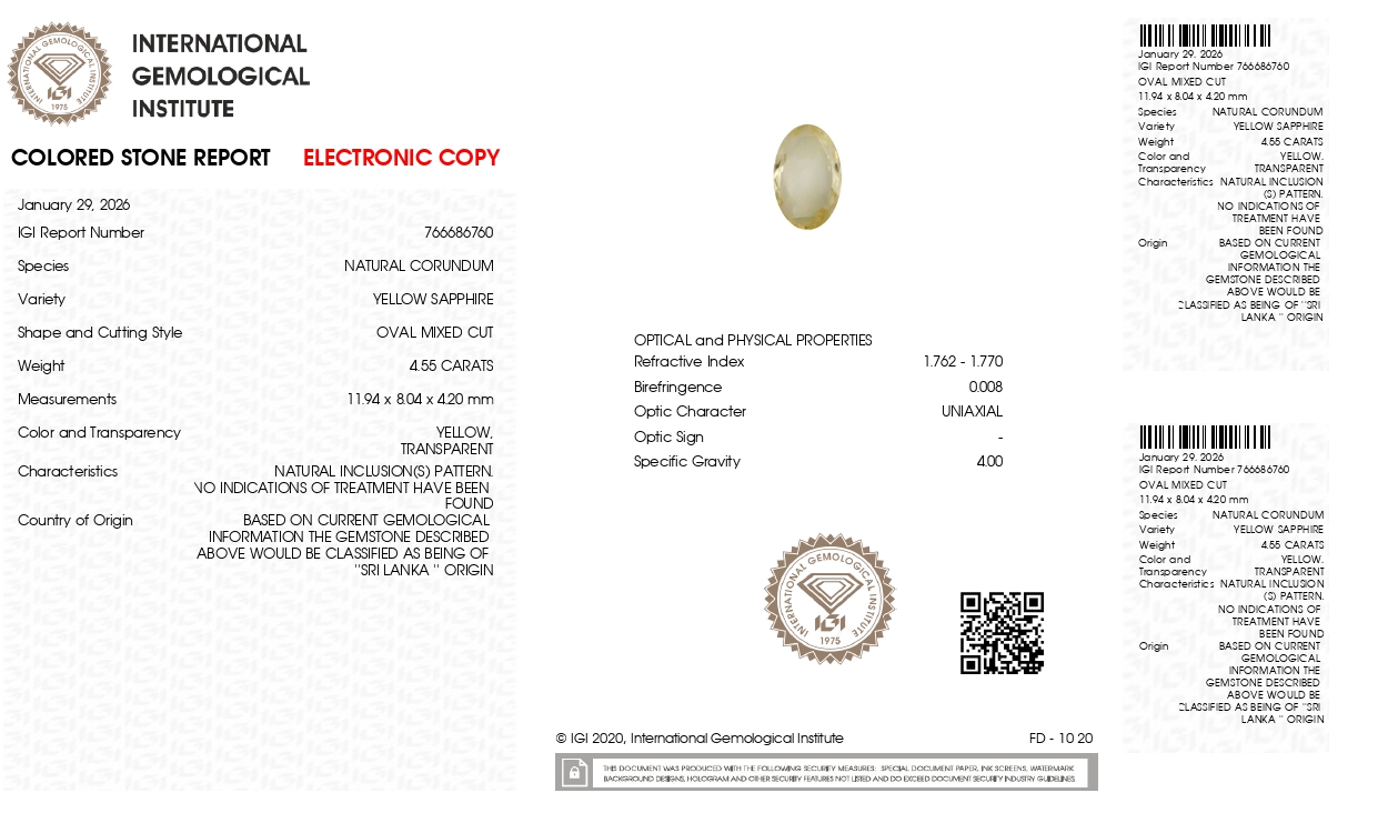 Buy one beautiful transparent 4.55 Carat/ 5.00 Ratti original yellow sapphire stone online.It has a oval shape, and a clarity grade of eye clean (evaluated at eye level), with good color intensity. The origin of this real yellow sapphire(pukhraj) stone is Ceylon(Sri Lanka). This yellow sapphires is 100% unheated & untreated and certified from IGI Lab.