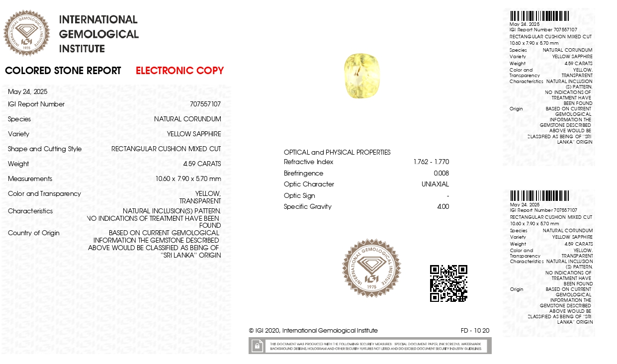 Buy one beautiful transparent 4.59 Carat/ 5.04 Ratti original yellow sapphire stone online . It has a Cushion shape, and a clarity grade of eye clean (evaluated at eye level), with good color intensity. The origin of this real yellow sapphire(pukhraj) stone is Ceylon(Sri Lanka). This yellow sapphires is 100% unheated & untreated and certified from IGI Govt. Lab.