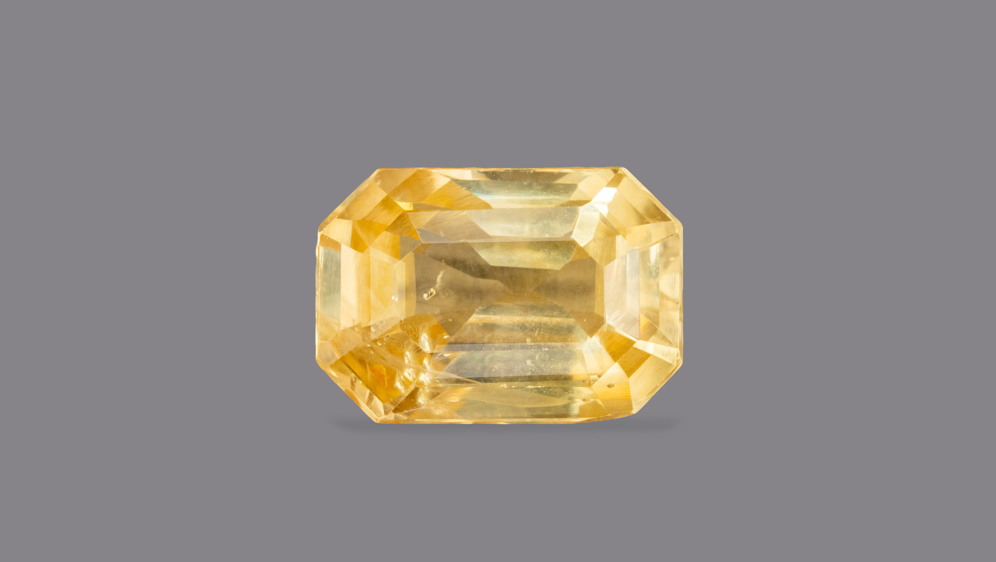 Buy one beautiful transparent 4.67 Carat/ 5.13 Ratti original yellow sapphire stone online.It has a emerald cut shape, and a clarity grade of eye clean (evaluated at eye level), with good color intensity. The origin of this real yellow sapphire(pukhraj) stone is Ceylon(Sri Lanka). This yellow sapphires is 100% unheated & untreated and certified from IGI Govt. Lab.