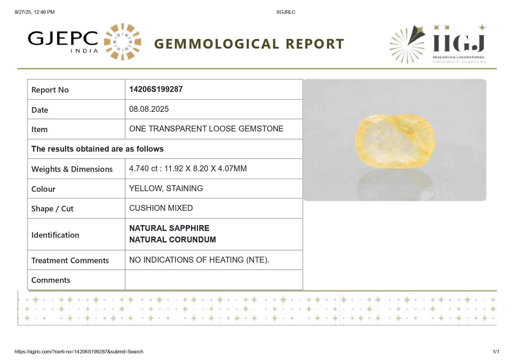 Buy one beautiful transparent 4.74 Carat/ 5.21 Ratti original yellow sapphire stone online . It has a cushion shape, and a clarity grade of eye clean (evaluated at eye level), with good color intensity. The origin of this real yellow sapphire(pukhraj) stone is Ceylon(Sri Lanka). This yellow sapphires is 100% unheated & untreated and certified from IIGJ Govt. Lab.