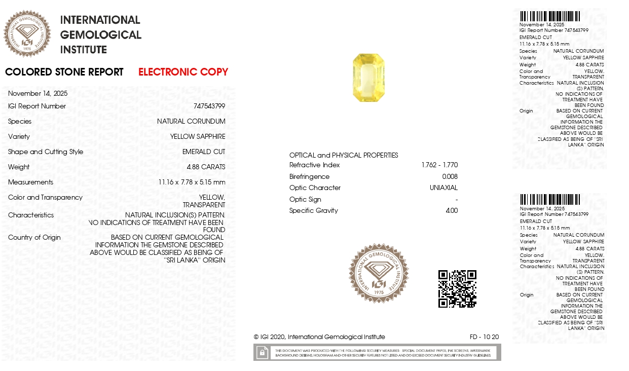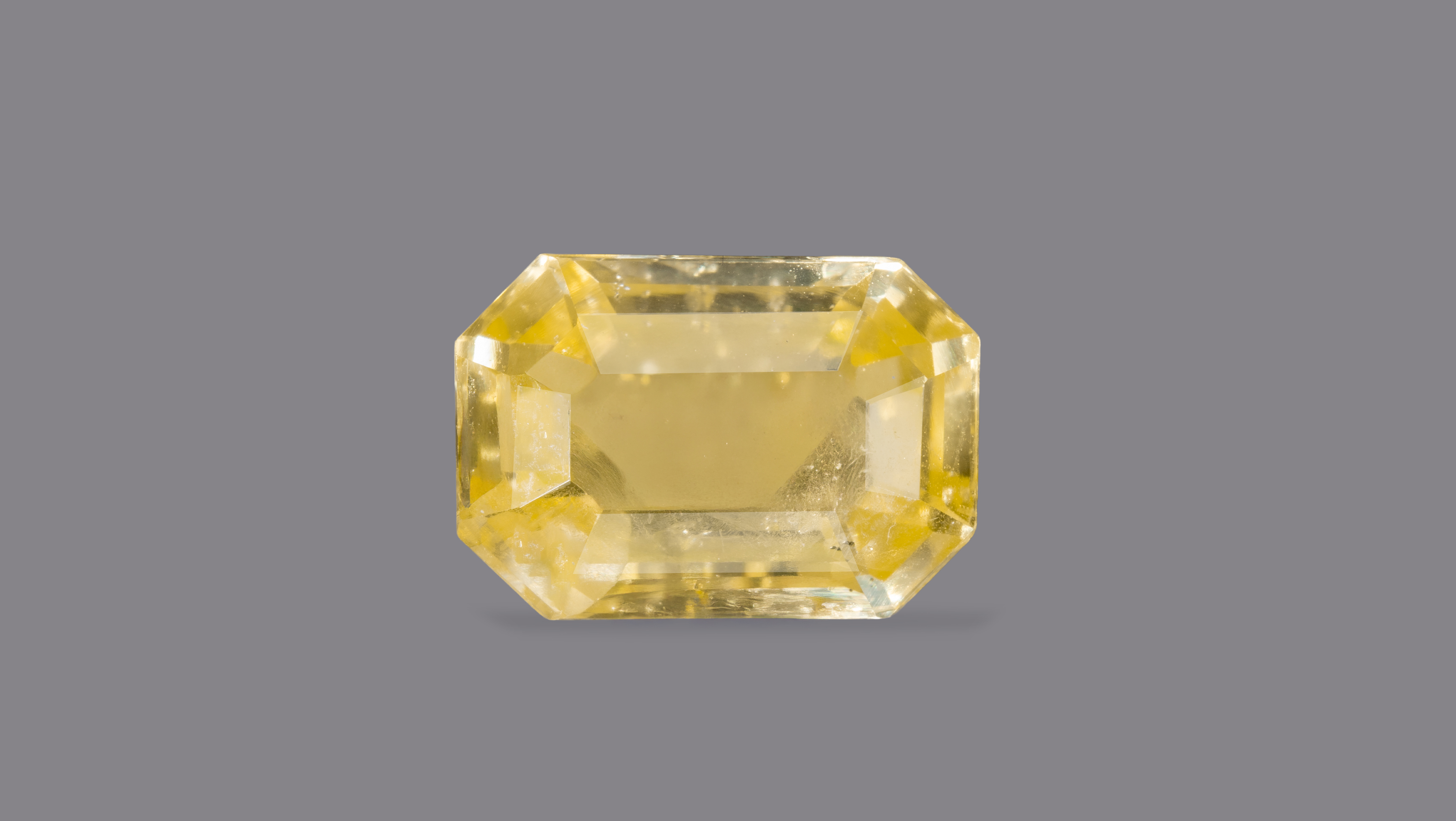 Buy one beautiful transparent 4.88 Carat/ 5.36 Ratti original yellow sapphire stone online.It has a emerald cut shape, and a clarity grade of eye clean (evaluated at eye level), with good color intensity. The origin of this real yellow sapphire(pukhraj) stone is Ceylon(Sri Lanka). This yellow sapphires is 100% unheated & untreated and certified from IGI Govt. Lab.