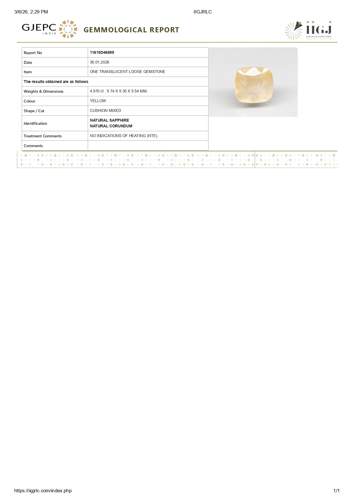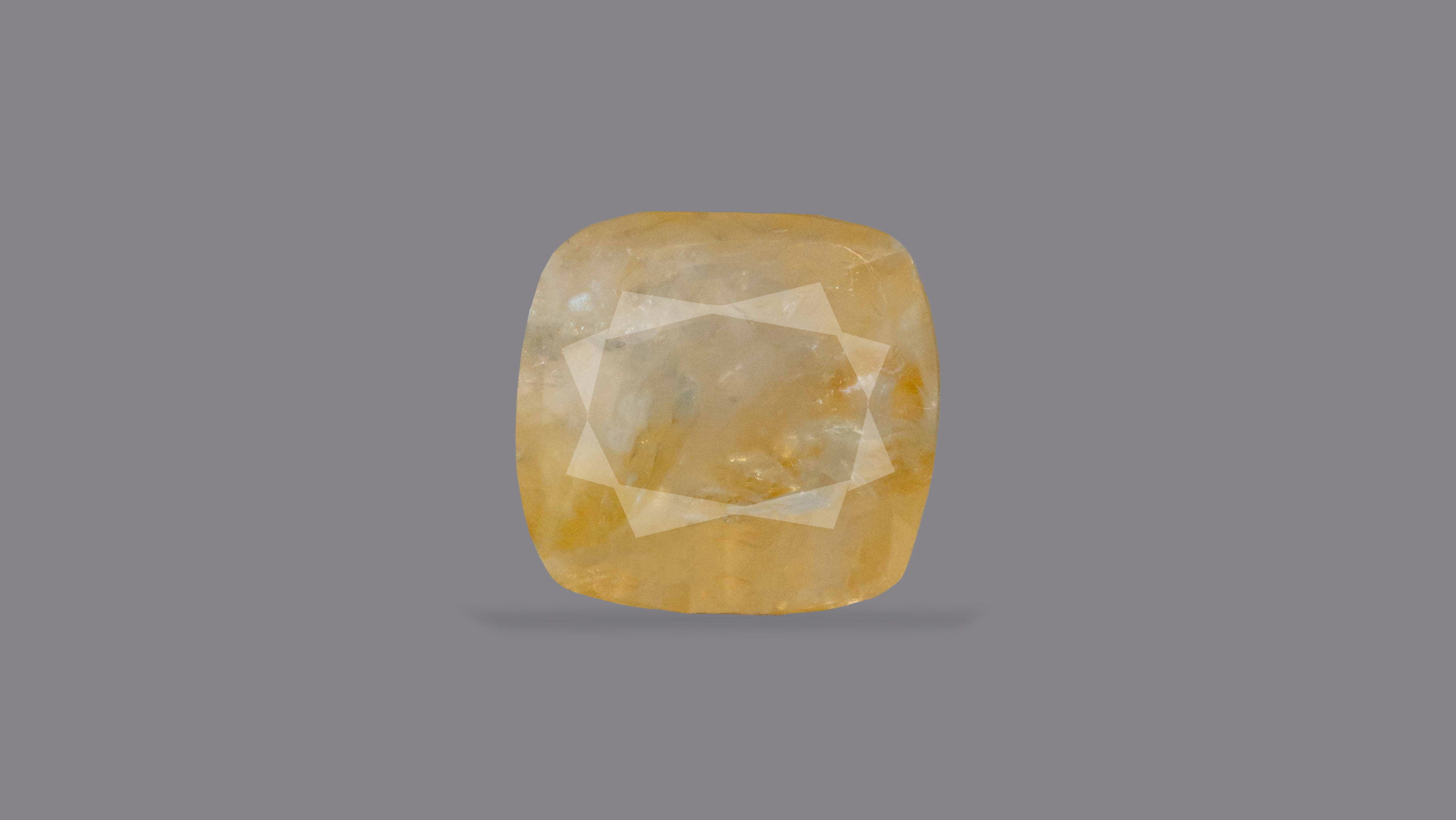 Buy one beautiful transparent 4.97 Carat/ 5.46 Ratti original yellow sapphire stone online.It has a Cushion shape, and a clarity grade of eye clean (evaluated at eye level), with good color intensity. The origin of this real yellow sapphire(pukhraj) stone is Ceylon(Sri Lanka). This yellow sapphires is 100% unheated & untreated and certified from IIGJ Lab.