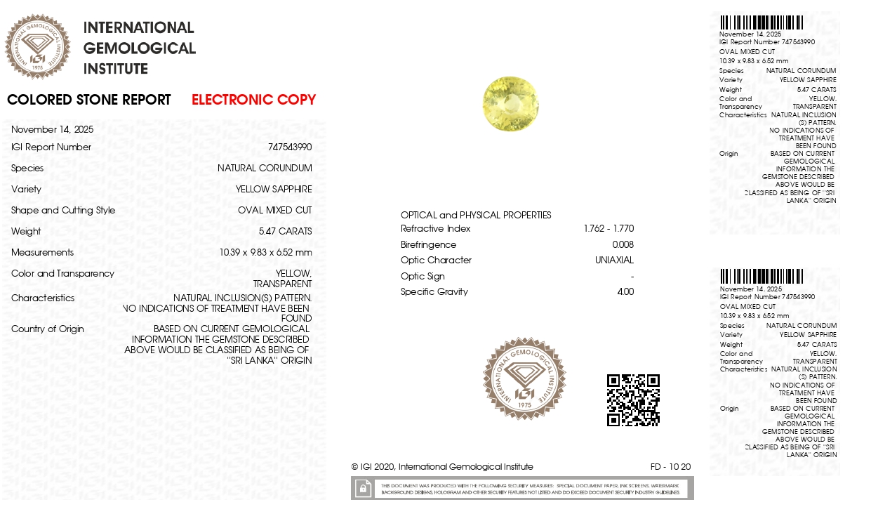Buy one beautiful transparent 5.47 Carat/ 6.01 Ratti original yellow sapphire stone online.It has a oval shape, and a clarity grade of eye clean (evaluated at eye level), with good color intensity. The origin of this real yellow sapphire(pukhraj) stone is Ceylon(Sri Lanka). This yellow sapphires is 100% unheated & untreated and certified from IGI Govt. Lab.