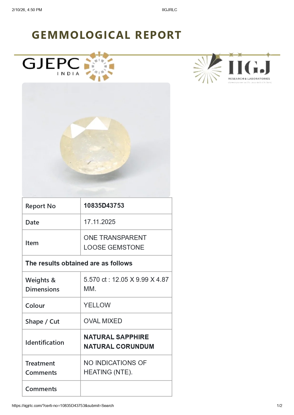 Buy one beautiful transparent 5.57 Carat/ 6.12 Ratti original yellow sapphire stone online.It has a oval shape, and a clarity grade of eye clean (evaluated at eye level), with good color intensity. The origin of this real yellow sapphire(pukhraj) stone is Ceylon(Sri Lanka). This yellow sapphires is 100% unheated & untreated and certified from IIGJ Govt. Lab.