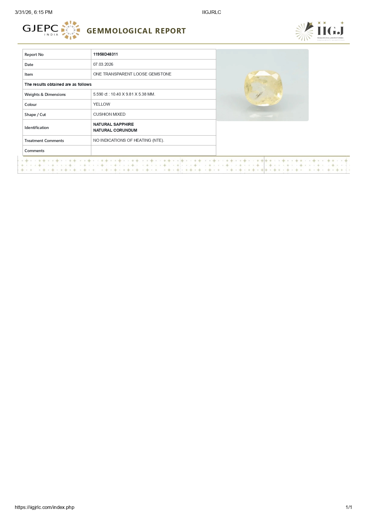 Buy one beautiful transparent 5.59 Carat/ 6.14 Ratti original yellow sapphire stone online.It has a Cushion shape, and a clarity grade of eye clean (evaluated at eye level), with good color intensity. The origin of this real yellow sapphire(pukhraj) stone is Ceylon(Sri Lanka). This yellow sapphires is 100% unheated & untreated and certified from IIGJ Lab.