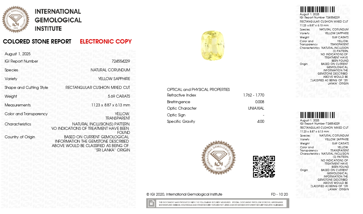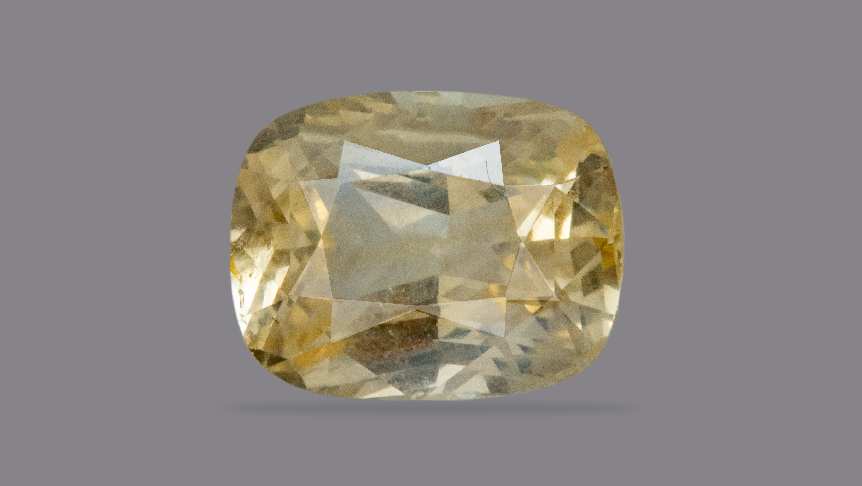 Buy one beautiful transparent 5.69 Carat/ 6.25 Ratti original yellow sapphire stone online . It has a Rectangular cushion cut shape, and a clarity grade of eye clean (evaluated at eye level), with good color intensity. The origin of this real yellow sapphire(pukhraj) stone is Ceylon(Sri Lanka). This yellow sapphires is 100% unheated & untreated and certified from IGI Govt. Lab.