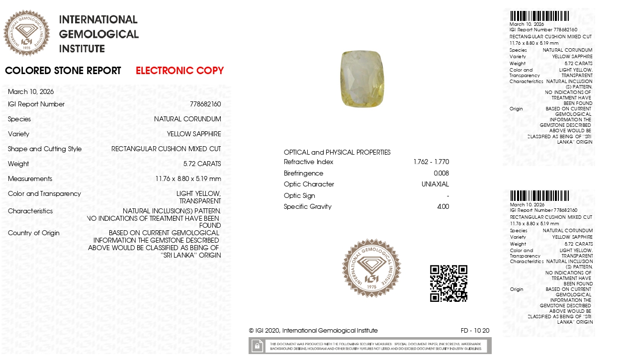 Buy one beautiful transparent 5.72 Carat/ 6.29 Ratti original yellow sapphire stone online.It has a Rectangular cut shape, and a clarity grade of eye clean (evaluated at eye level), with good color intensity. The origin of this real yellow sapphire(pukhraj) stone is Ceylon(Sri Lanka). This yellow sapphires is 100% unheated & untreated and certified from IGI Lab.