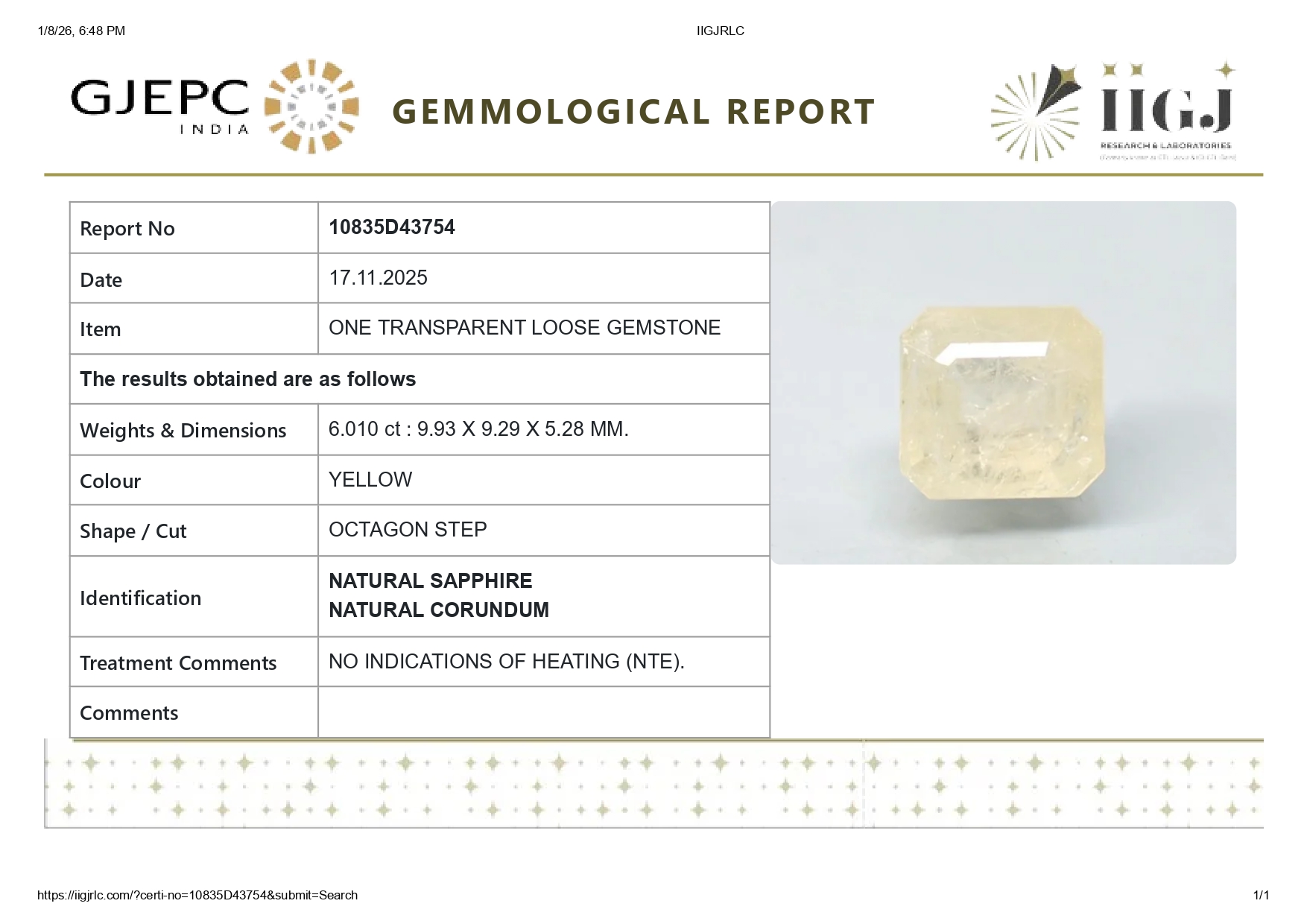 Buy one beautiful 6.01 transparent 6.60 Carat/ 11.15 Ratti original yellow sapphire stone online.It has a Octagon shape, and a clarity grade of eye clean (evaluated at eye level), with good color intensity. The origin of this real yellow sapphire(pukhraj) stone is Ceylon(Sri Lanka). This yellow sapphires is 100% unheated & untreated and certified from IIGJ Govt. Lab.