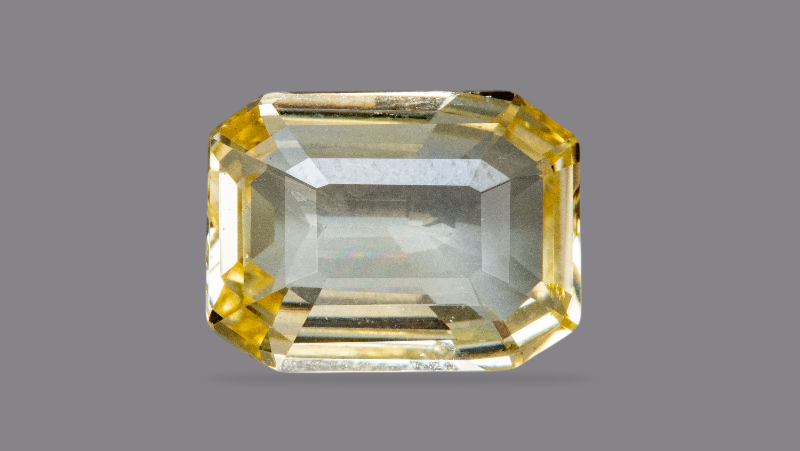 Buy one beautiful transparent 6.40 Carat/ 7.03 Ratti original yellow sapphire stone online with the dimensions of 12.50 x 9.30 x 4.90 mm. It has a emerald cut shape, and a clarity grade of eye clean (evaluated at eye level), with good color intensity. The origin of this real yellow sapphire(pukhraj) stone is Ceylon(Sri Lanka). This yellow sapphires is 100% unheated & untreated and certified from IGI Govt. Lab.